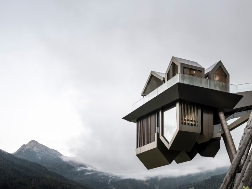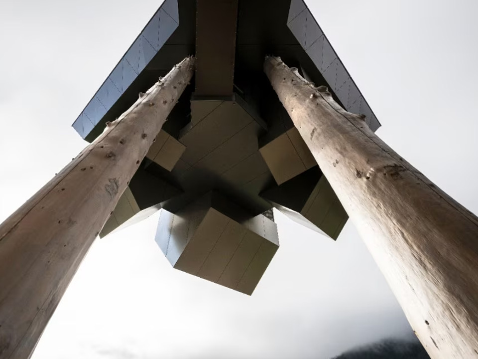 Distribuita su due livelli, l’architettura si stacca dal corpo principale, supportata da due pilastri rivestiti in tronchi di larice: la piattaforma a sbalzo, separata dall’edificio e sospesa a 15 metri dal livello del terreno, è raggiungibile attraverso una passerella, un parallelepipedo vetrato che osserva il paesaggio