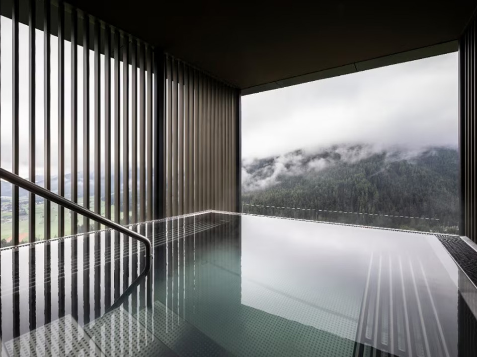 I tetti capovolti rappresentano una scelta funzionale, oltre che un valore estetico: nella loro forma trovano posto infatti sia l’impianto di depurazione dell’acqua sia le gradinate della sauna. Nelle cabine i pavimenti sono in ceramica beige, mentre nella sala relax il pavimento è in legno di rovere oliato bianco. Tra elementi sospesi volti a stupire, colori e matericità tipici della montagna, lo studio vuole seguire la strada di una sfida alla gravità per proporre uno scenario inedito di rapporto con l’architettura e col paesaggio.
