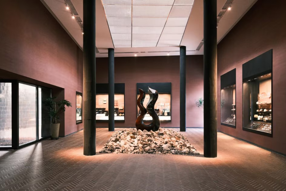Il complesso è composto da un’aggregazione di cinque volumi essenziali, di dimensioni e quote differenti che evocano i petali di un fiore (come simbolo di fortuna, nella cultura cinese) e si avvolgono attorno alle tracce della miniera al livello sotterraneo: un percorso espositivo a forma di vortice, che parte dalla superficie fino alle viscere della terra, collega tre sale al piano terra e il tunnel sotterraneo della miniera in un’unica sequenza arricchita da contributi multimediali.