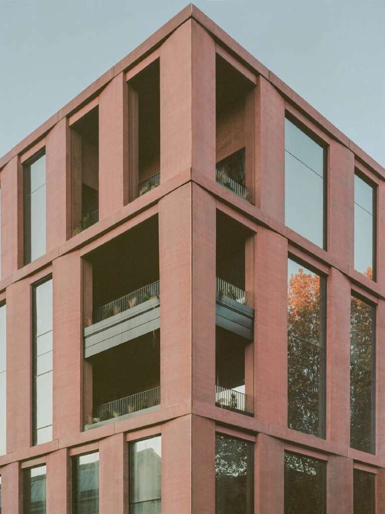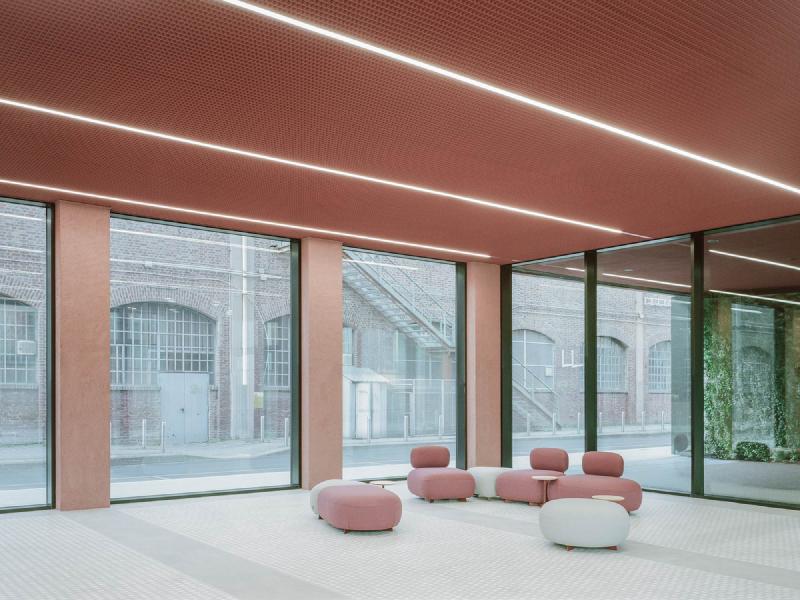 The terracotta-coloured fibre cement façade of the new building is characterised by large, evenly spaced windows that interact with the surrounding structures, functioning as a bridge between past and future. The two entrances on the ground floor allow visitors to pass through the Open 336 building, from one side to the other, thus creating a sense of passage and connection, as well as permeability to the liveliness of the neighbourhood. The lobby is a large, bright, glazed space in harmony and continuity with the outside. The building is contaminated by greenery, from the wall gardens next to the entrance to the main terrace on the top floor and smaller ones on the intermediate floors.