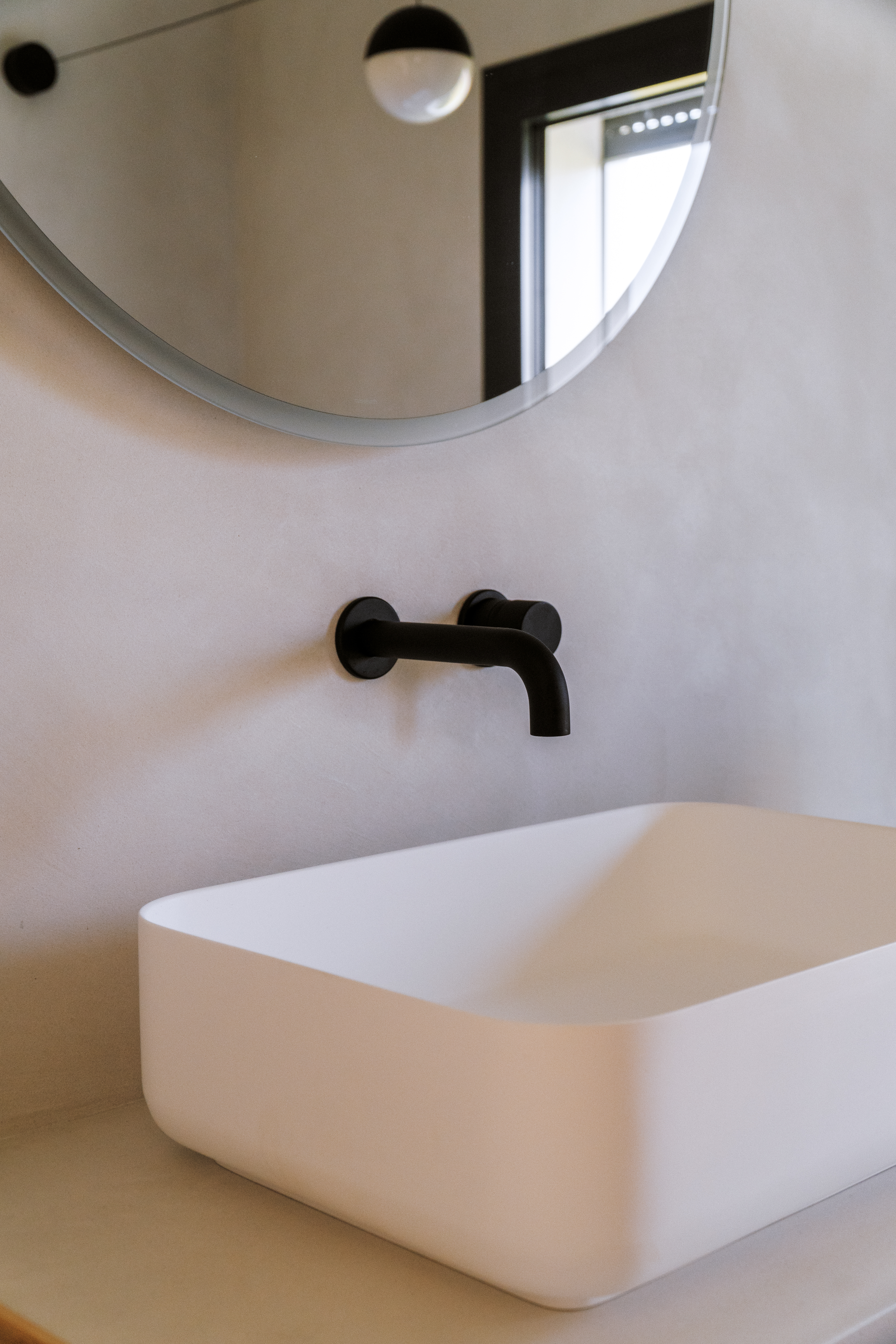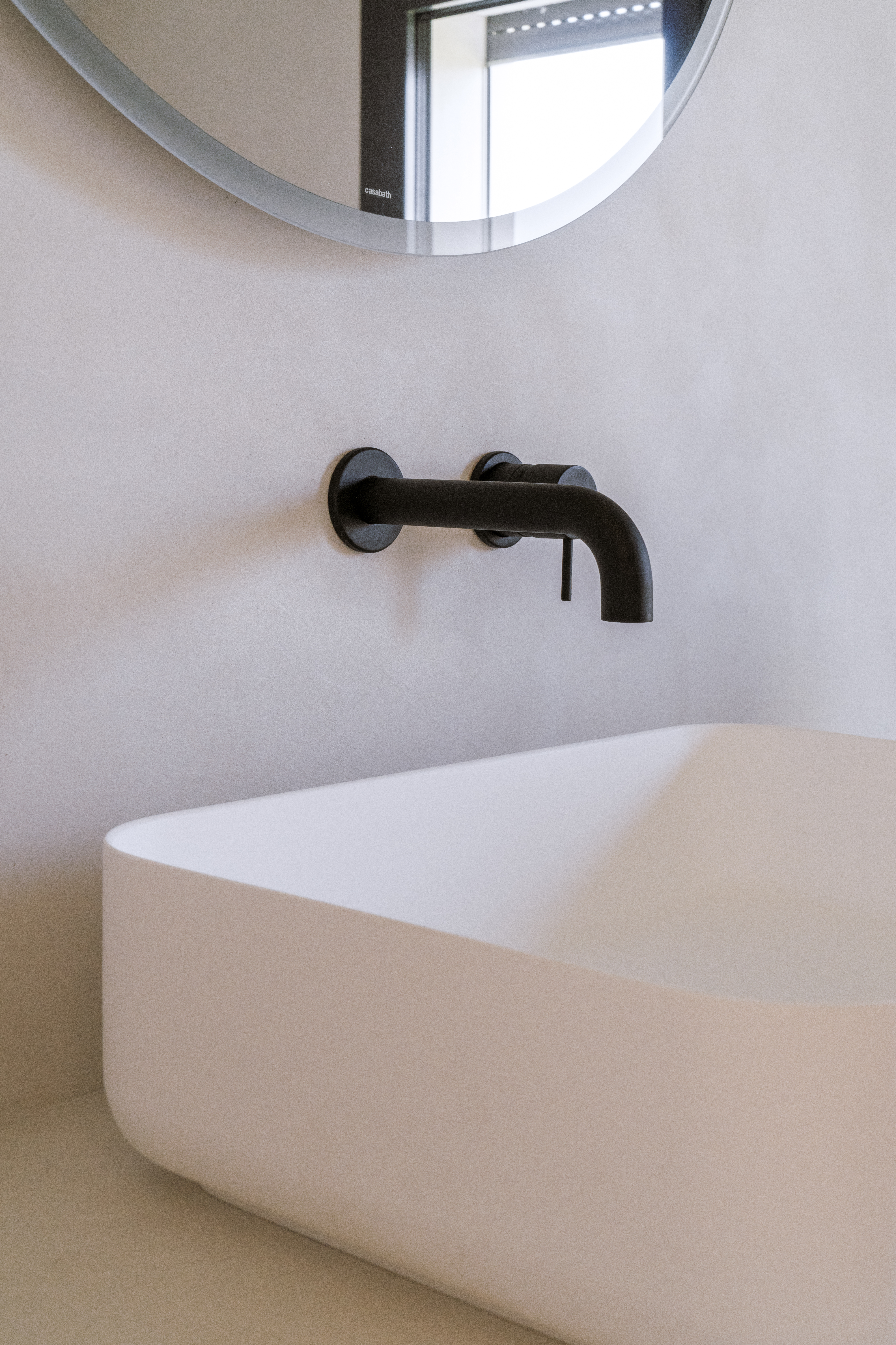 Nei bagni, dove sono stati previsti lavabi da appoggio, la scelta è ricaduta sul miscelatore da incasso a muro con getto da 215mm.