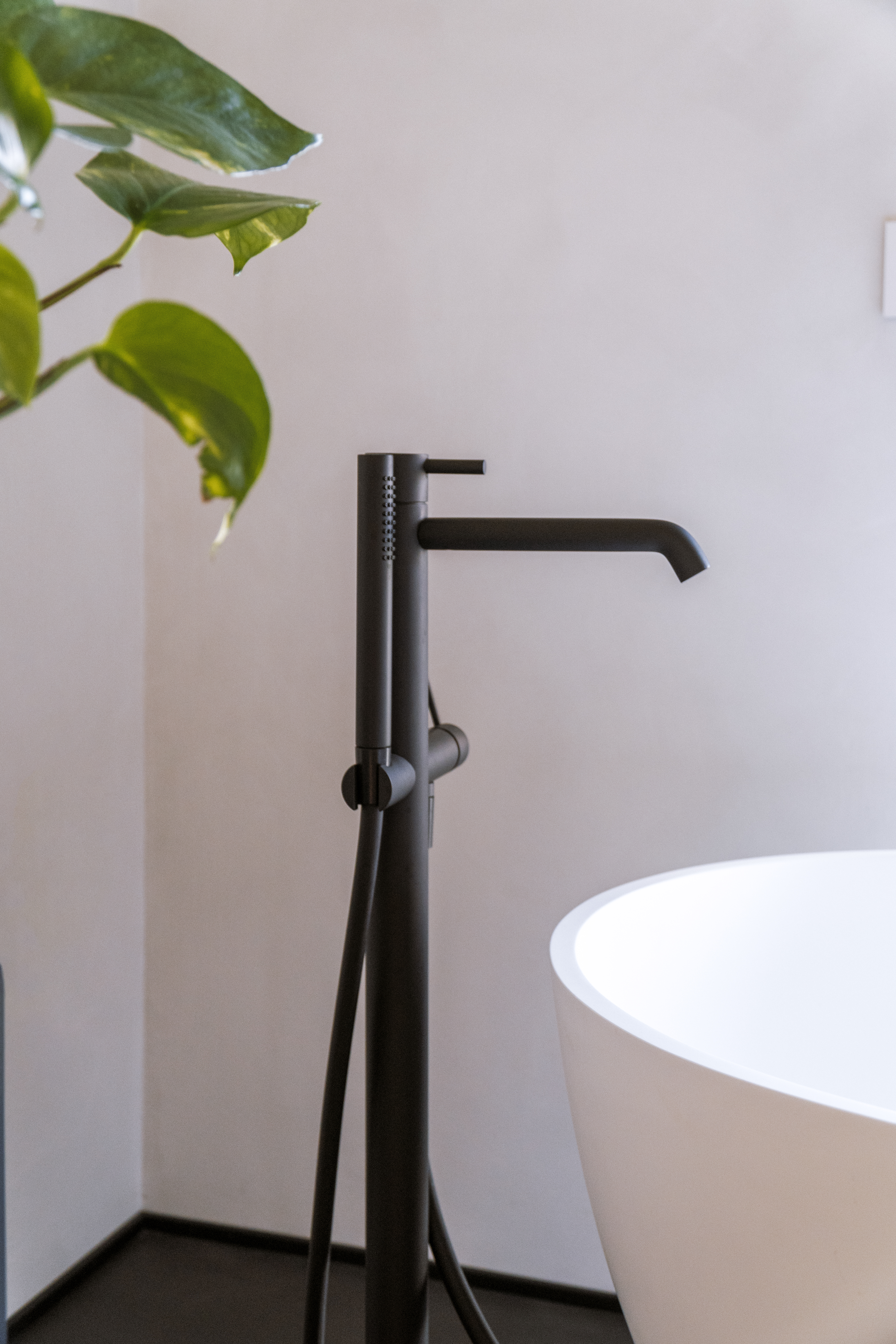 Per la vasca freestanding è stata scelta la soluzione con colonna da terra, dotata di due miscelatori e doccetta stilo.