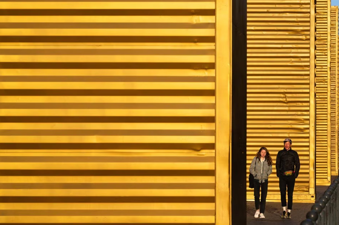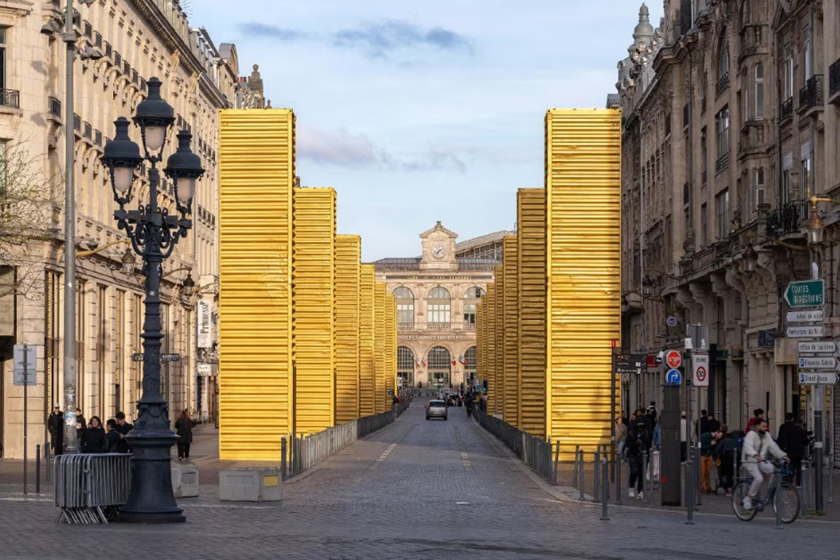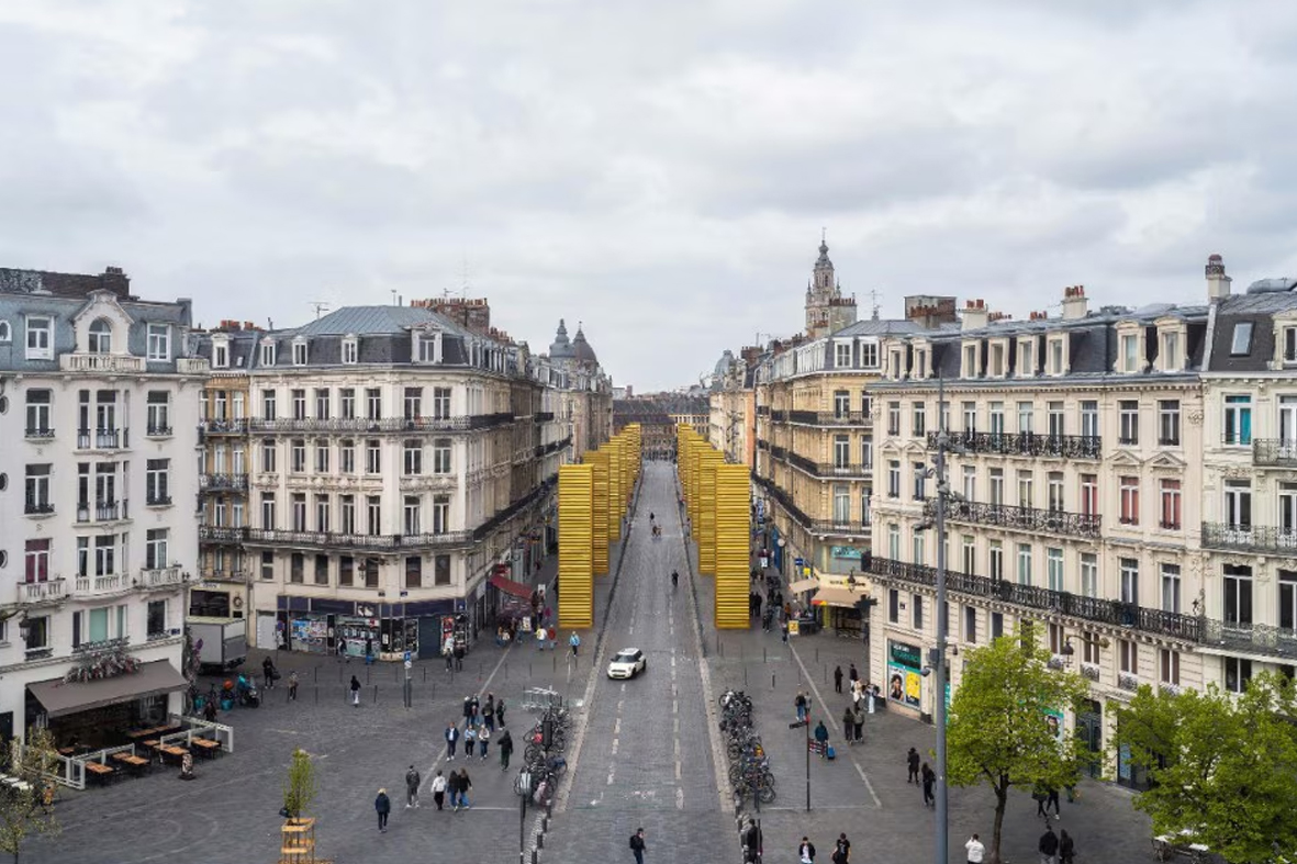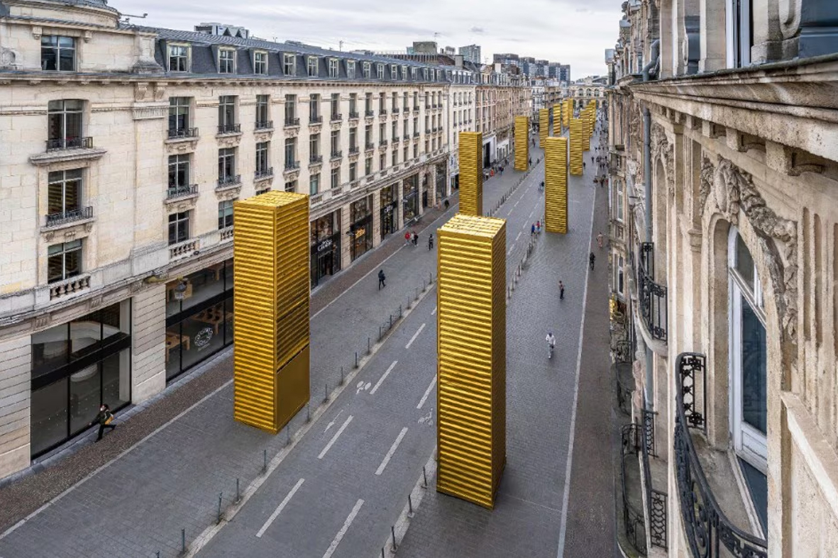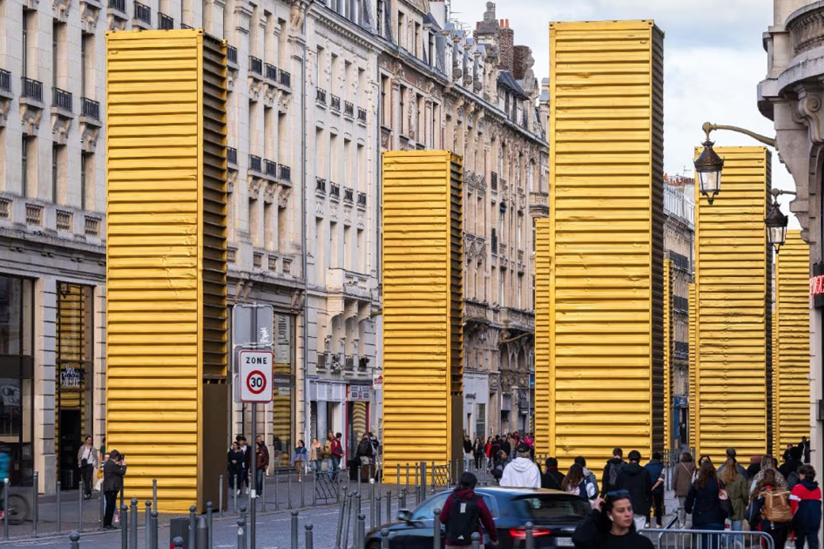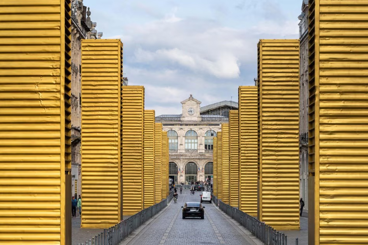 The Spanish urban artist SpY intervenes on the urban fabric of Lille, in northern France, with Golden Monoliths, a public installation with a strong visual and symbolic impact. Fourteen maritime containers, ordinary elements of global trade, are emptied of their original function and recontextualized as vertical columns entirely covered in gold, arranged along the main axis of the city. The gesture, simple and powerful, transforms an ordinary street into a ceremonial corridor, suggesting a new perception of urban space.