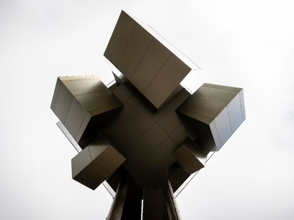 Designed as a suspended, upside-down village, the building shows a surrealist architecture that focuses on the idea of reflection and the reversal of viewpoints, similar to a landscape reflected in water.