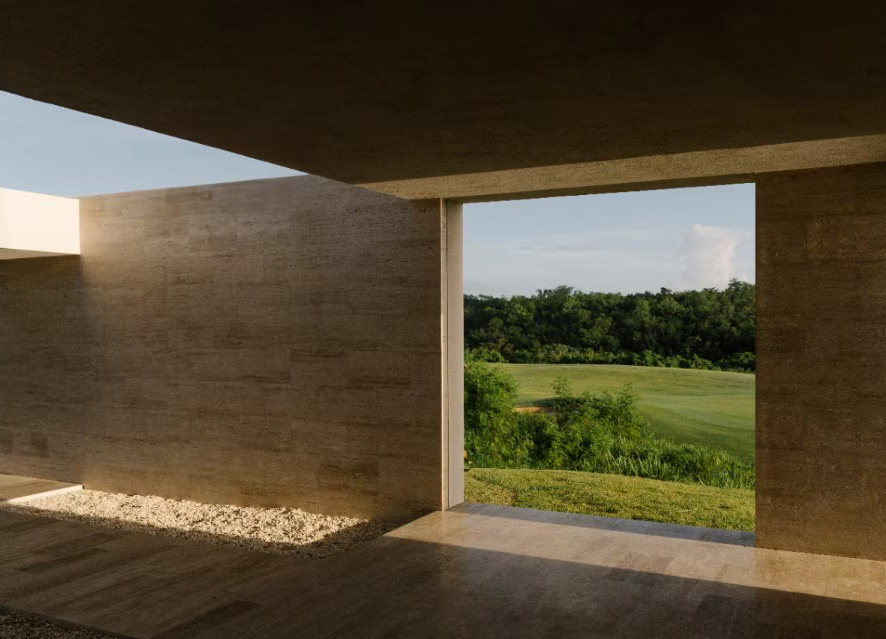 The dialogue between solids and voids, light and shadow, and the play of reflections on the pool’s water, which duplicates the Caribbean sky, lend a vaguely «contemplative» quality to the composition. This is accentuated in the interiors—finished with natural materials (stone, wood, and plaster) and punctuated by textured furnishings—where a peaceful and refined atmosphere reigns.