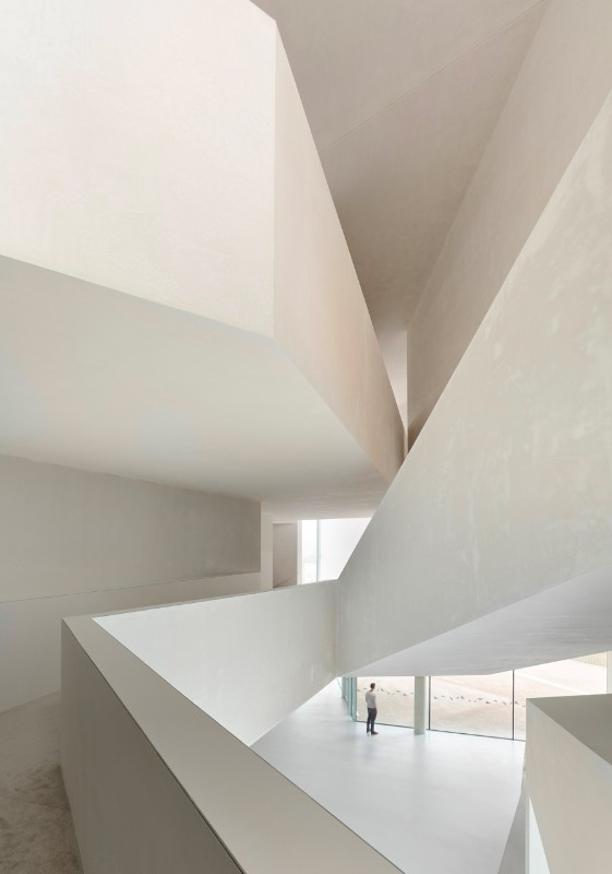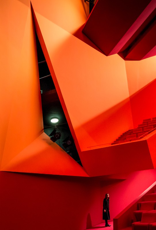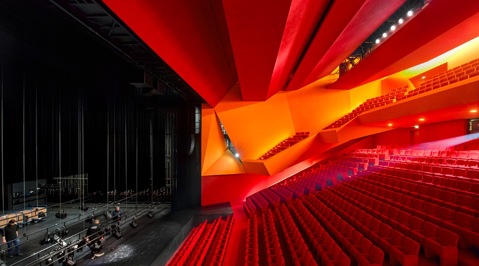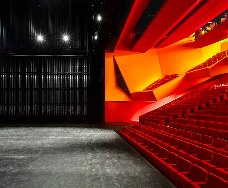 The theatre Dominique Coulon & associés carried out at Freyming-Merlebach, France, starts a formal dialogue with the varied urban landscape and it models itself on the context and regarding the logic of the existing flows. Its unusual shape and its dimensions give it a special aspect. Its lines ensure a visual transition among the various parts of the programme, keeping the same dimensions of the urban context. The visitor’s attention is captured by the dynamism of volumes: in the upper part, the foyer overhangs to show the entrance while in the lower part the transparent elements allow the rich interior paths to be half seen. The foyer occupies a vertical space, with a network of staircases leading to the auditorium. The slanting lines follow the complex geometry of the site and they ensure that the spaces expand. The auditorium contrasts with the neutral surfaces of the external envelope. The building has a lily-white façade while the foyer shows some beige shades. The 700-seat auditorium, instead, is characterised by red, pink and orange shades. The colours confirm the idea of a show.