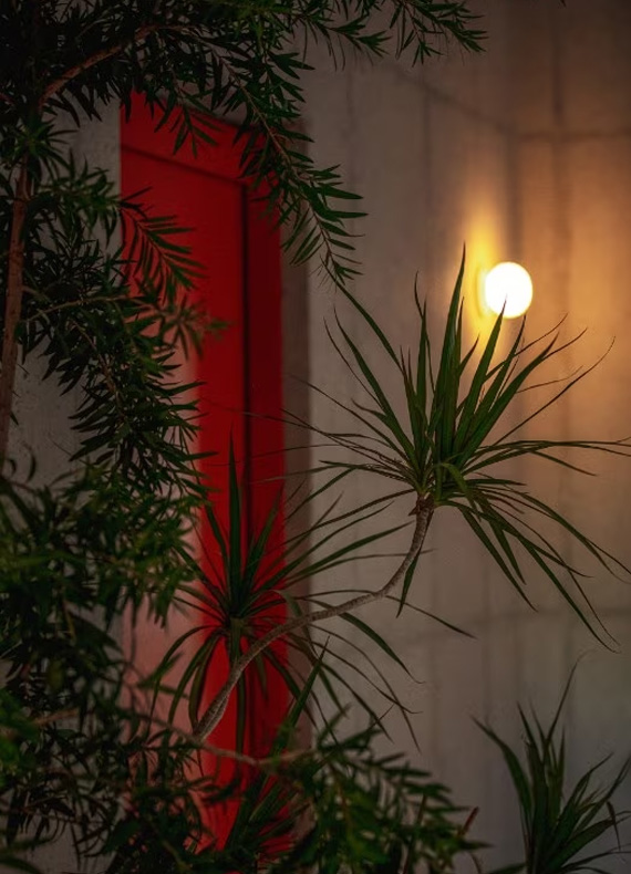 Through the floor plan, the design reveals its essentiality in the interior arrangement, where a series of contractions and expansions of space define the rooms of the house. The raw concrete finishes are also matched in the home’s interior with a few orange furnishing elements that are placed in the various rooms. The large living room in the centre of the volume connects all the spaces seamlessly and faces the outside of the house. This transition, between inside and outside, is facilitated in two ways. One way is through the thick walls that convey a feeling of protection and emphasise the body of the building. The other way is through a hole in the prism, which has allowed the creation of a protected courtyard, a natural space within the built volume of the house.