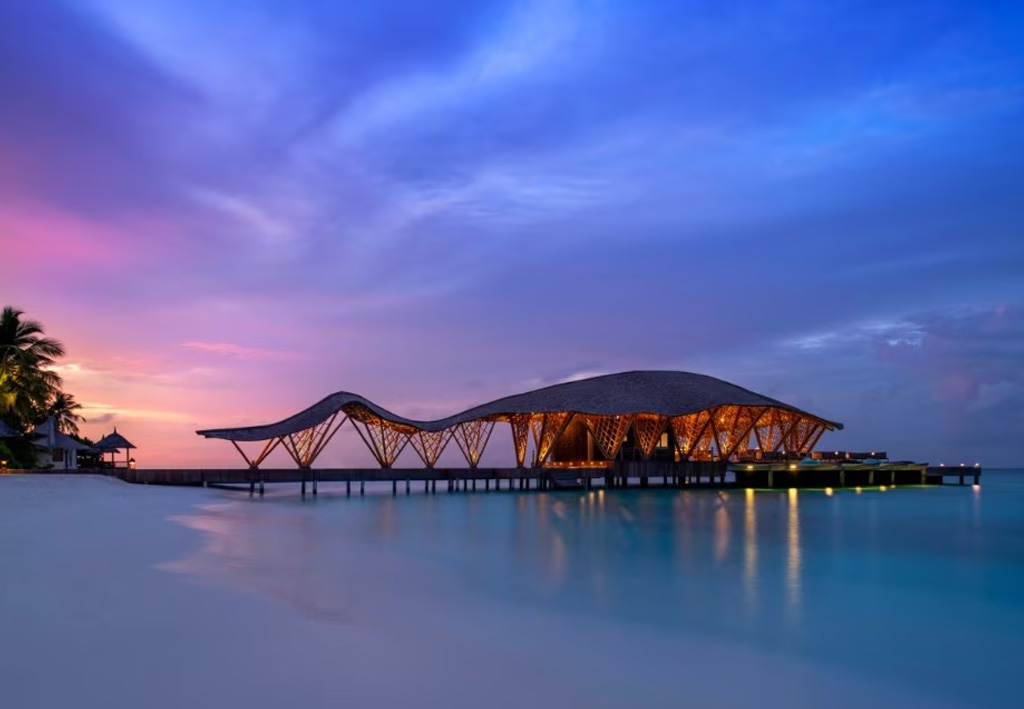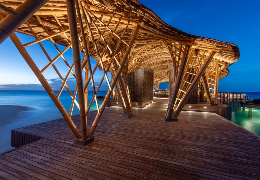 The structure, designed by Dutch studio Atelier Nomadic and located at the Banyan Tree Vabinfaru resort, uses bamboo as its main material and seems to float on the surface of the ocean, ready to head out to sea. The architecture, named Madi Hiyaa, is also inspired by the Dhivehi language, where Madi means «ray» and Hiyaa «shelter», referring to the graceful rays that migrate across the Indian Ocean.