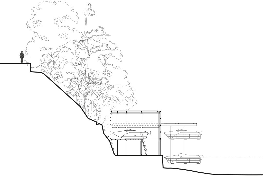 The limited dimensions of the boathouse, six meters wide and just eight meters deep, also show the wanted compromise between functional needs and the complex location. This facility gently adapts to the rocky surface of the bank, which is as heterogeneous as unstable, that has been consolidated. This intervention also concerned the quay where it was possible to work during the five hours of low tide a day, only; it also required the use of special additives in the concrete.