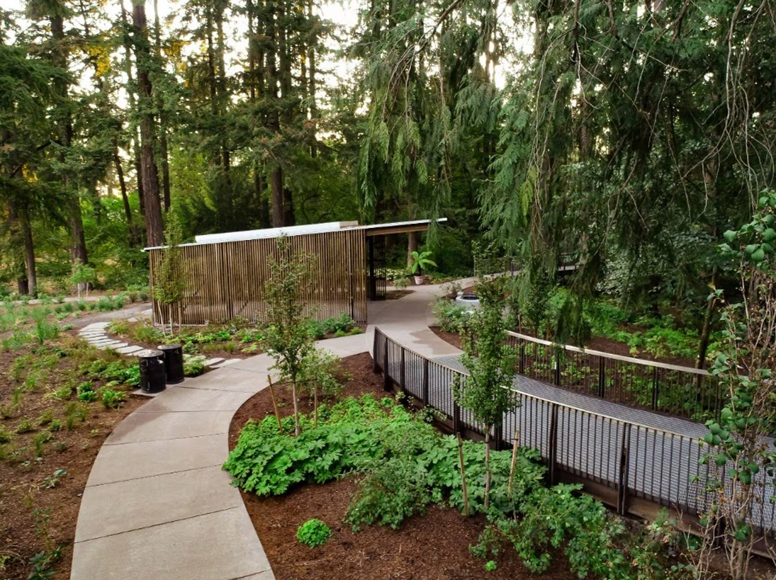 The pavilion, called the Fireside Terrace, is an outdoor, covered structure with slatted wooden walls. The garden actually has a rich history: first used by the natives as a place for hunting, fishing, and camping, in the second half of the 19th century it became part of a sawmill that supplied timber for the construction of houses in Portland.