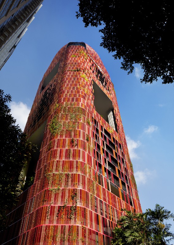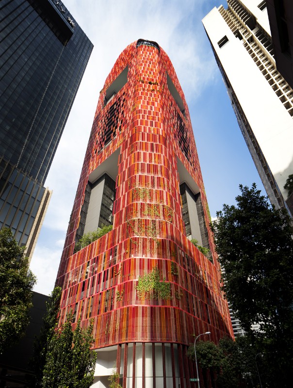 According to the design for the tower-hotel Oasia Downtown planned by WOHA in the Central Business District in Singapore, the façades were conceived as a real landscape plan. The red wire netting, enveloping the building, is the element which consents the proliferation of a luxuriant vegetation. The building won the Best Tall Building Worldwide 2018 prize during the 16th edition of the Annual Council on Tall Buildings and Urban Habitat (CTBUH).