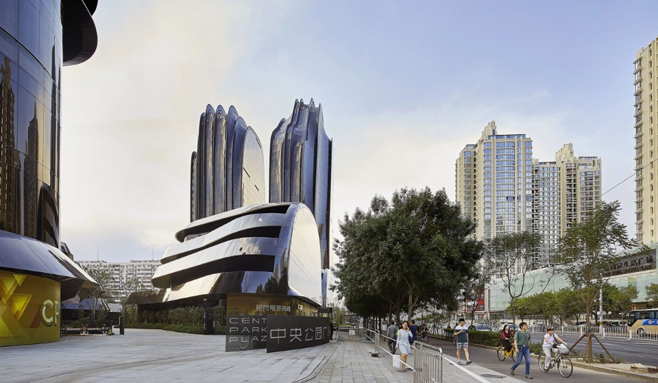 The Chaoyang Park Plaza by MAD Architects in Beijing is characterized by smooth and curved surfaces consisting of white and black elements. It evokes the excitement and the appearance of the traditional Chinese ink painting and it offers a peaceful shelter, protected from the surrounding city chaotic background. This project adds two towers as offices on the northern side of the area which lie on the shore of a small lake with an annexed park; they remind two mountains reflected on the water. The low commercial buildings, on a smaller scale, remind the mountain rocks which are eroded with time. They seem to be positioned randomly, but the mutual relationship is strategical and creates a protected but open urban garden where people can meet and enjoy a little bit of nature in the city. The landscape, which is created among the buildings, includes pines, bamboo trees, rocks and ponds: they are all elements of the eastern landscape which link contemporary architecture and traditions. The project was certified with the LEED Gold Certification of the Green Building Council USA: the vertical small wings placed on the façade made of glass work as a ventilation system and as a filter to improve the energy efficiency helping the cooling of interiors. At the base of the towers the small lake works as a cooling system in Summer time decreasing inside temperatures.