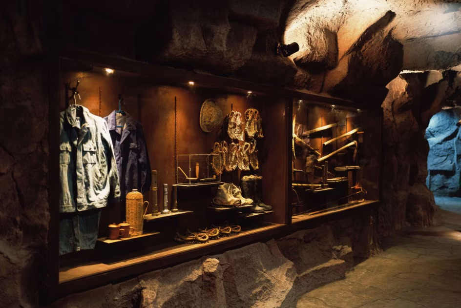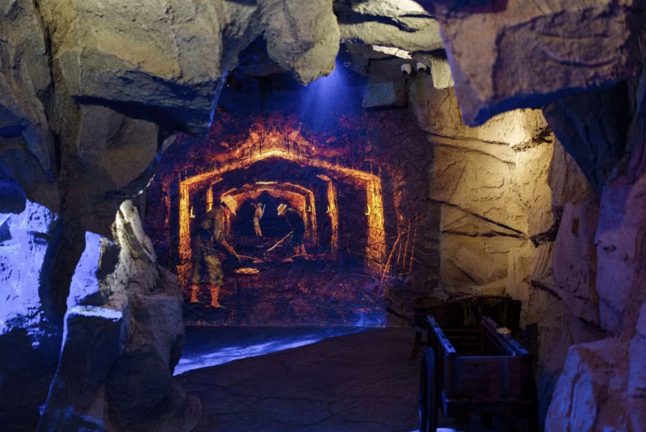 The complex is composed of five essential volumes of varying sizes and heights, reminiscent of flower petals (a symbol of good fortune in Chinese culture) that wrap around the underground mine tunnels. A vortex-shaped exhibition path, stretching from the surface to the bowels of the earth, connects three ground-floor rooms and the mine’s underground tunnel in a single sequence enriched by multimedia content.