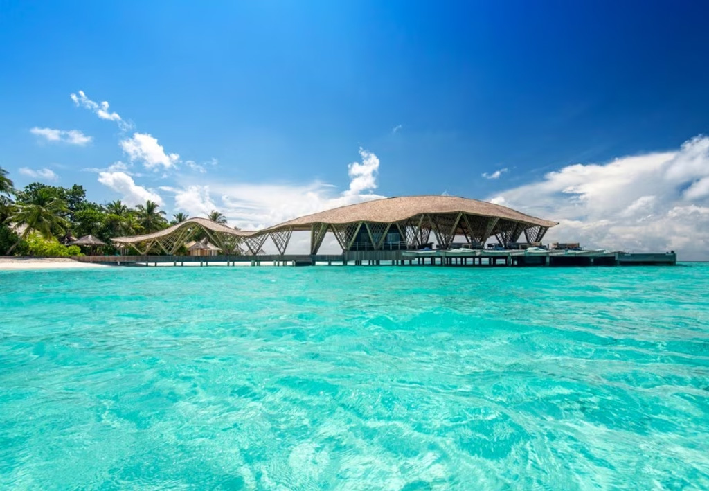 The structure, designed by Dutch studio Atelier Nomadic and located at the Banyan Tree Vabinfaru resort, uses bamboo as its main material and seems to float on the surface of the ocean, ready to head out to sea. The architecture, named Madi Hiyaa, is also inspired by the Dhivehi language, where Madi means « ray » and Hiyaa « shelter », referring to the graceful rays that migrate across the Indian Ocean.