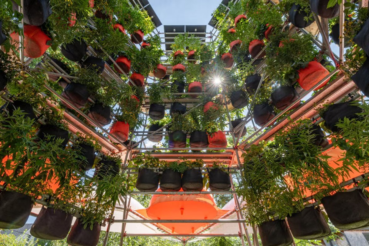The scaffolding is combined to create a vertical tower, stabilized by counterweights and metal wires, and then wrapped in rows of native potted plants, which attract visits from local pollinators.