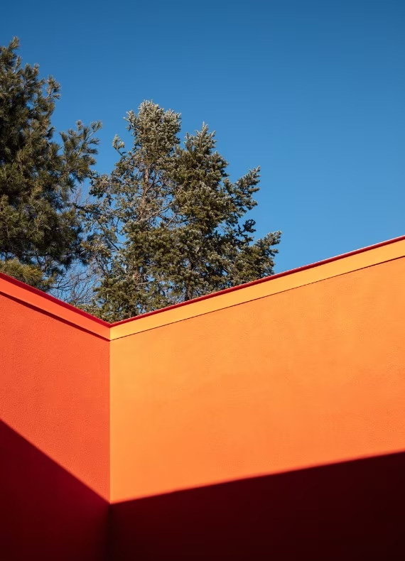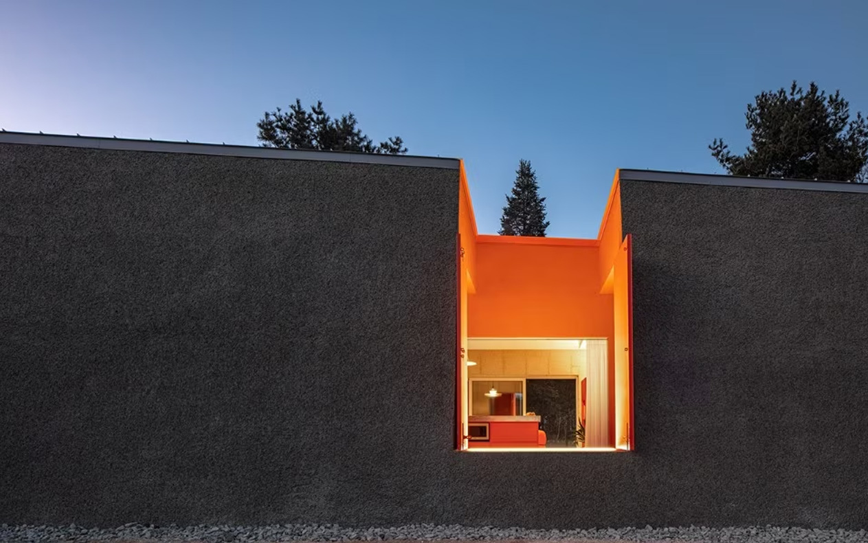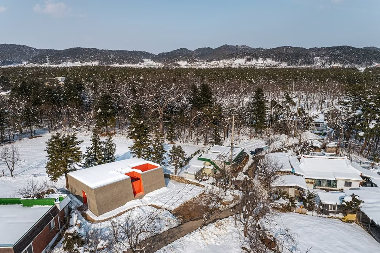 Un prisma puro, come una roccia incastonata nel territorio, che viene scavato, e dove ogni sottrazione si colora d’un arancio acceso, a ricordare il foliage tipico dell’area. Doldam è una residenza privata che si trova nel Mt. Seorak National Park, in Corea del Sud, progettata dallo studio One-aftr. Ed è proprio il paesaggio del parco che ha ispirato gli elementi salienti di questa architettura, che si fa interpretazione dell’ambiente: i colori, infatti, così come le formazioni rocciose dell’area, sono allo stesso tempo catturati come degli scatti fotografici dalle aperture della casa, e tradotti nei suoi elementi.