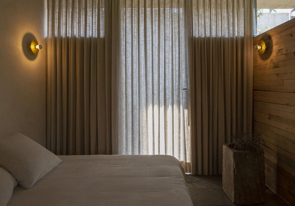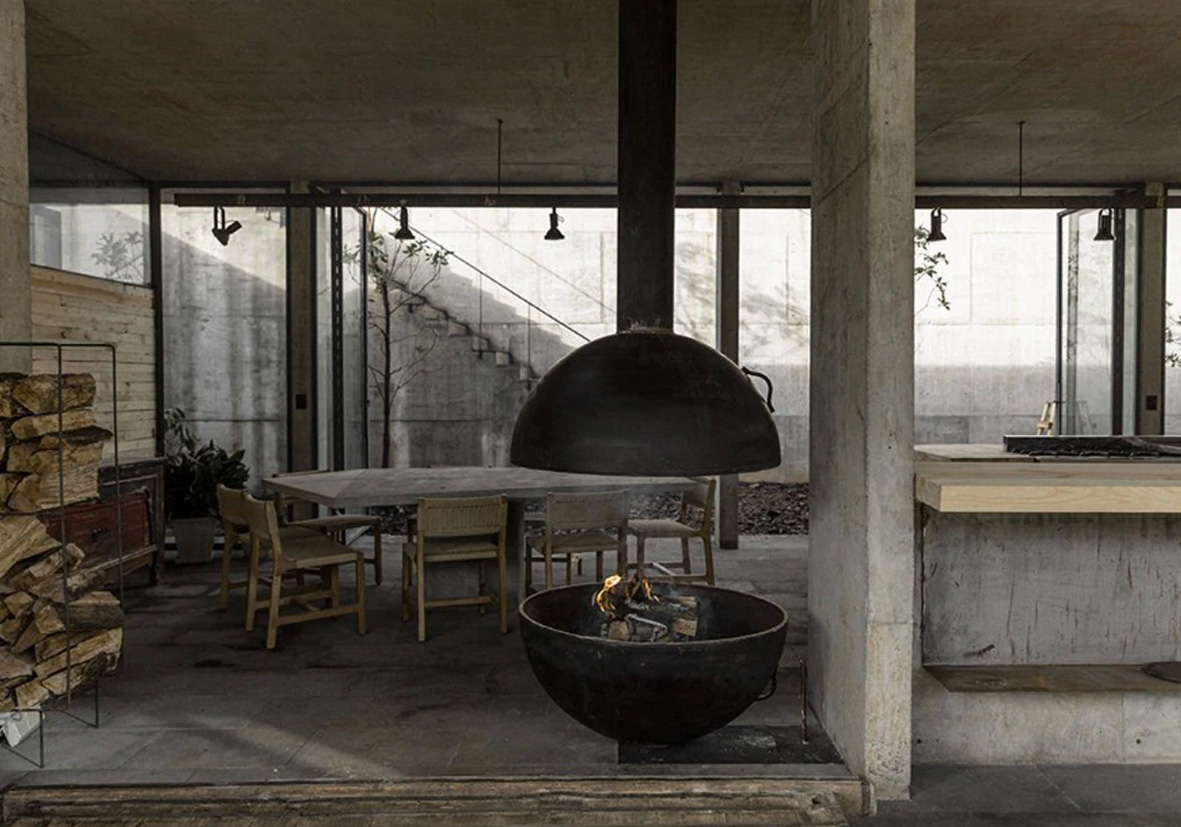 Gli interni sono caratterizzati da un design sobrio con minime esigenze manutentive ma accattivante: la struttura in calcestruzzo a vista si combina con pareti rivestite di Chukum, uno stucco naturale della regione dello Yucatan, e legno di pino grezzo riciclato; elementi d’arredo su misura – la cucina, il camino in metallo nero– dichiarano un’attenzione meticolosa ai dettagli e alla volontà di caratterizzazione di uno spazio essenziale, quasi monastico, ma caldo e accogliente.