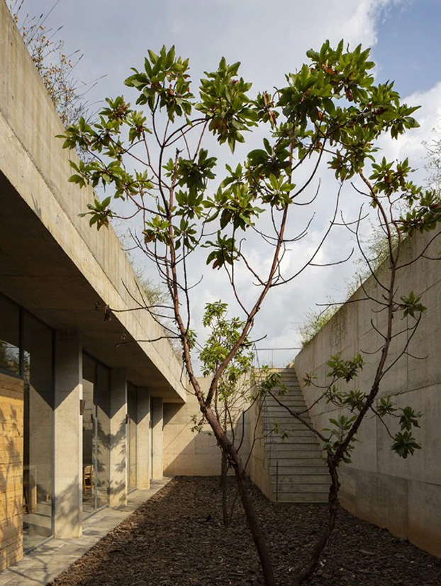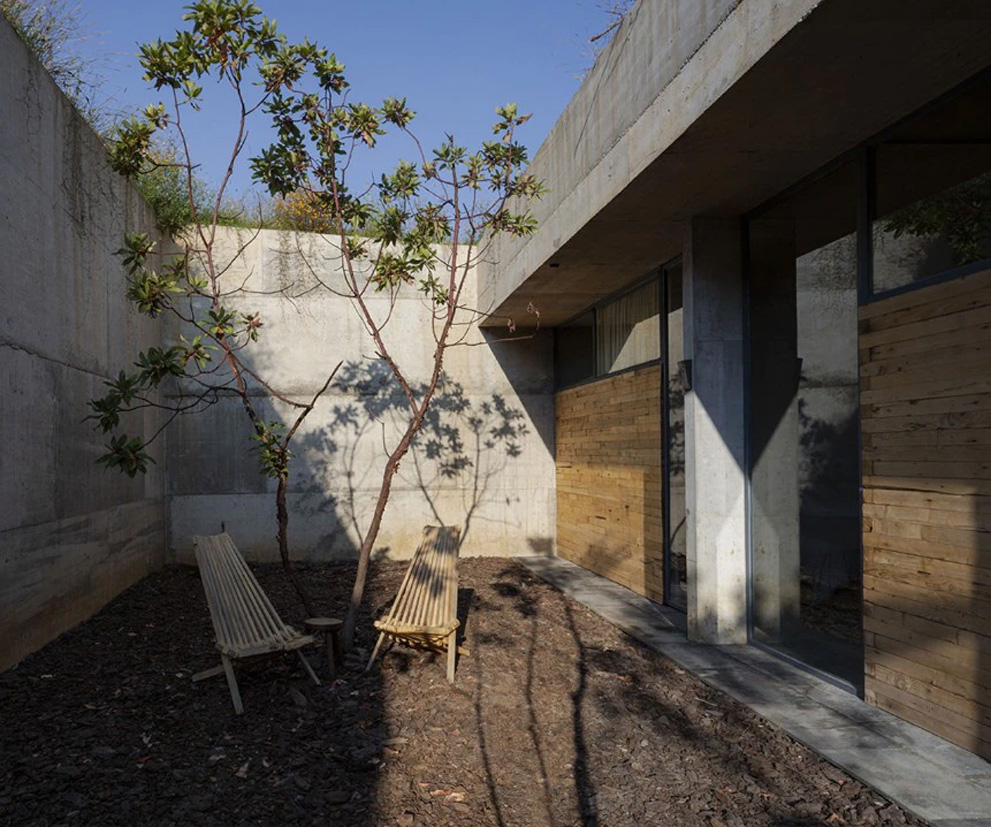 La casa parzialmente ipogea si addossa infatti alla collina da cui è sovrastata con una copertura a verde da cui emergono gli alberi di avocado: una soluzione paesaggisticamente ma anche tecnologicamente efficace, dal momento che offre condizioni termiche interne ottimali in una zona interessata da notevoli escursioni, grazie alla terra in copertura che funge da isolamento e mantiene l’abitazione a una temperatura costantemente mite.