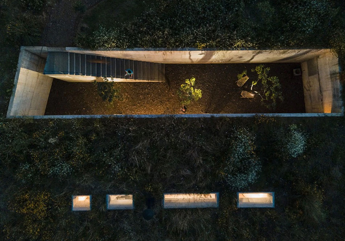 All’interno, il volume incastonato nel terreno si dispiega come un grande contenitore in cemento a vista con una layout funzionale e flessibile grazie alle ridotte pareti divisorie. La zona giorno centrale dà accesso ad una terrazza panoramica con vasca idromassaggio e vista sulla foresta e collega i vari ambienti adiacenti: la cucina, la sala da pranzo e il soggiorno, le camere da letto (quella principale, quella per bambini, due per gli ospiti) e lo studio. Sul fronte opposto, un patio scavato nel terreno fornisce un ulteriore accesso e garantisce una seconda fonte di luce e ventilazione naturale.