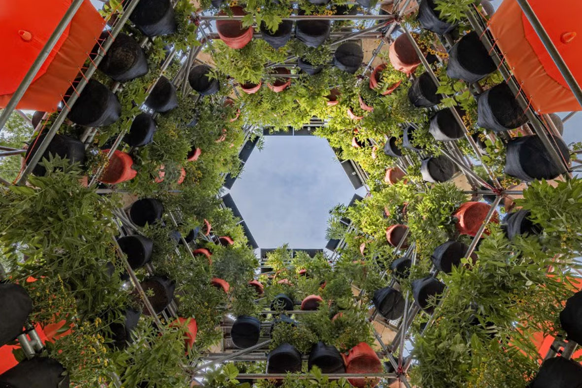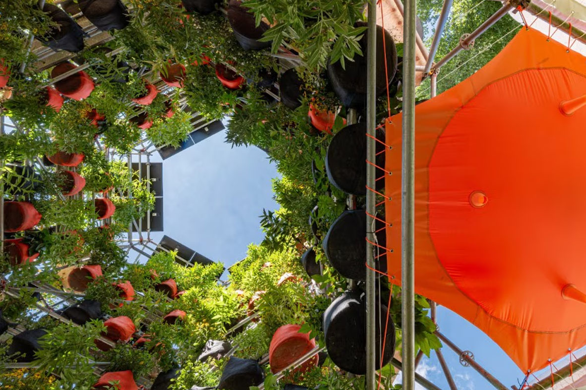 L’impalcatura viene combinata per creare una torre verticale, stabilizzata da contrappesi e fili metallici, e poi avvolta da file di piante autoctone in vaso, che attirano le visite degli impollinatori locali.