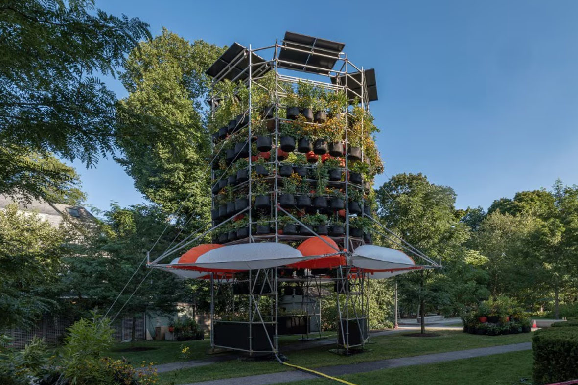 Nel campus dell’Harvard University è stata installata una mini-architettura temporanea, parte di un progetto accademico per dimostrare una “strategia a breve termine che genera istantaneamente biodiversità e comfort climatico”. Progettata dallo studio madrileno Ecosistema Urbano, Polinature è una torre modulare con tende gonfiabili e pile di piante autoctone, capace di mitigare gli effetti del cambiamento climatico nelle aree urbane.