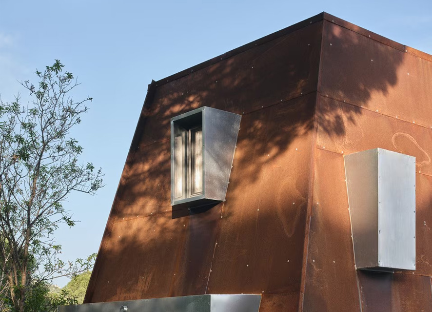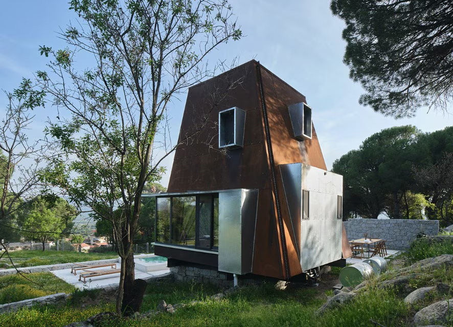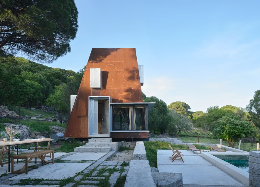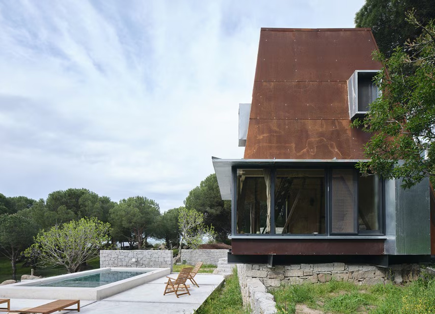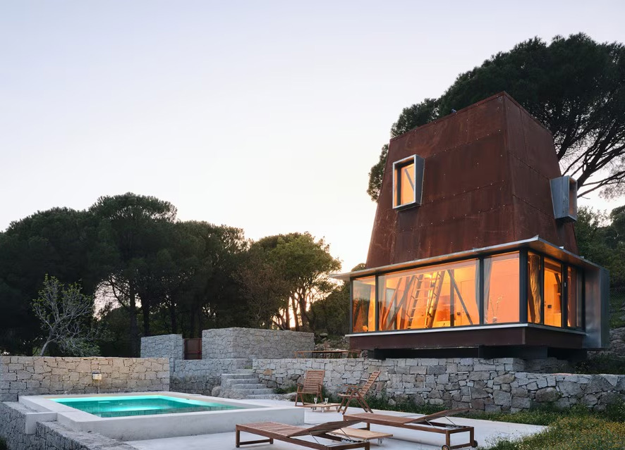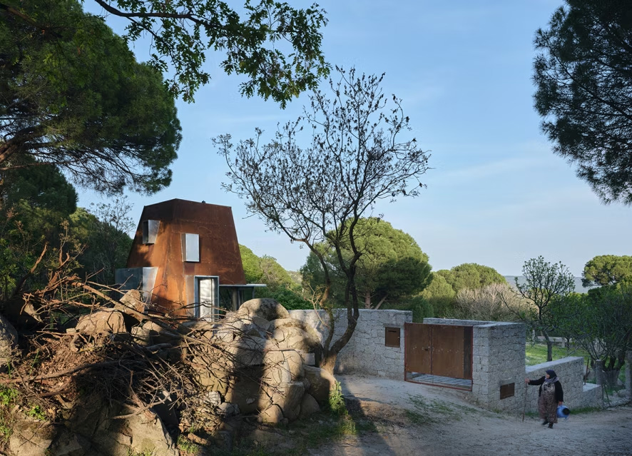 L’abitazione per le vacanze immersa nella vegetazione dell’altopiano di Kozak, a Pergamo, presenta un’architettura leggera che si poggia sul suolo lavorato e pietroso. La sua struttura interna in acciaio è rivestita all’esterno con pannelli di corten, mentre l’interno si caratterizza per l’uso del legno chiaro, disegnando uno spazio minimo che si sviluppa in altezza.