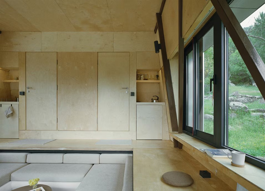 Da qui, un soppalco accoglie la zona notte e un piccolo luogo per il lavoro, mentre la sezione della capanna si restringe, a richiamare la forma di una tenda.