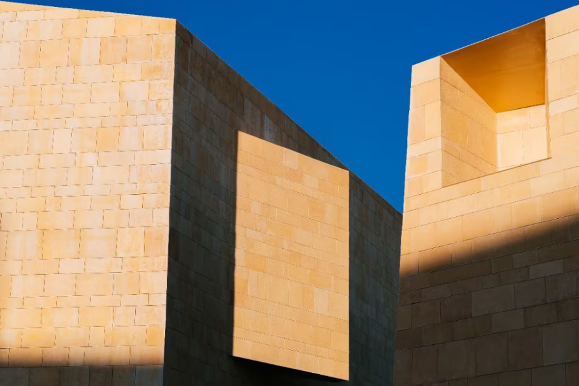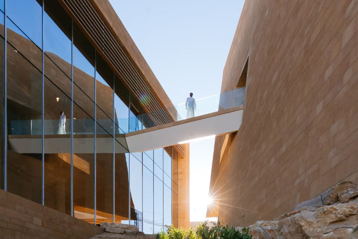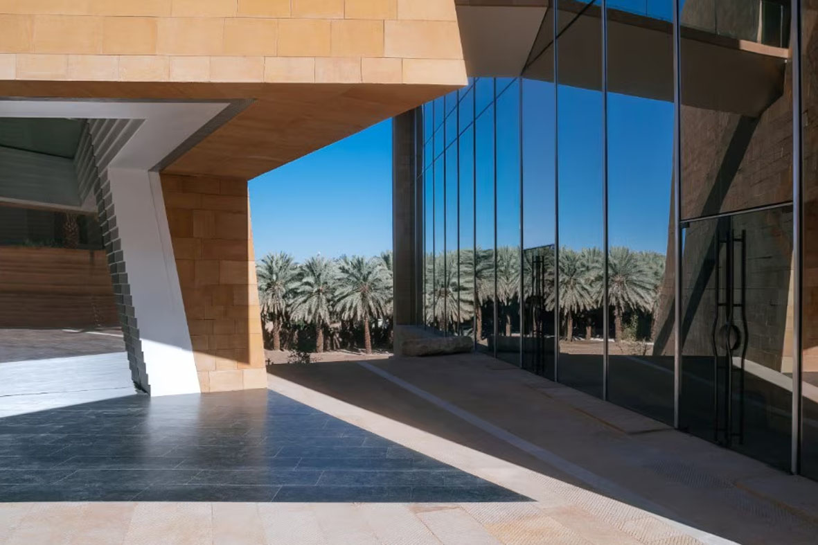 L’architettura dialoga con il contesto storico e geografico: il sito si trova vicino al patrimonio Unesco di At-Turaif e segue il tracciato delle antiche mura di Diriyah, lungo una scarpata che degrada verso un fertile wadi. L’edificio, definito “di confine”, combina volumi semplici separati da fenditure che favoriscono ventilazione naturale e connessioni con un parco adiacente.