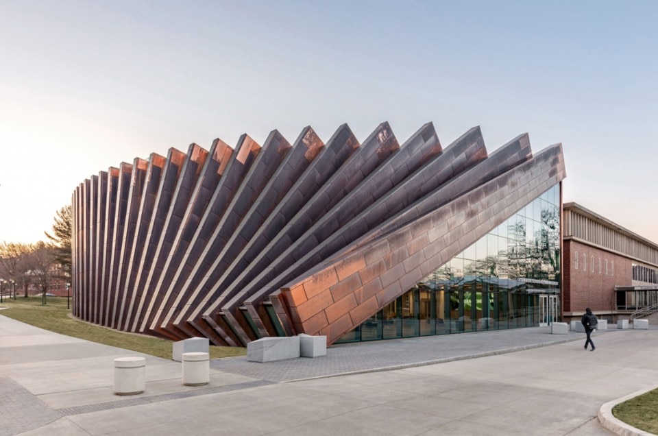 University of Massachussets Amherst Un’estensione circolare di rame e vetro crea un dialogo con gli edifici commerciali intorno