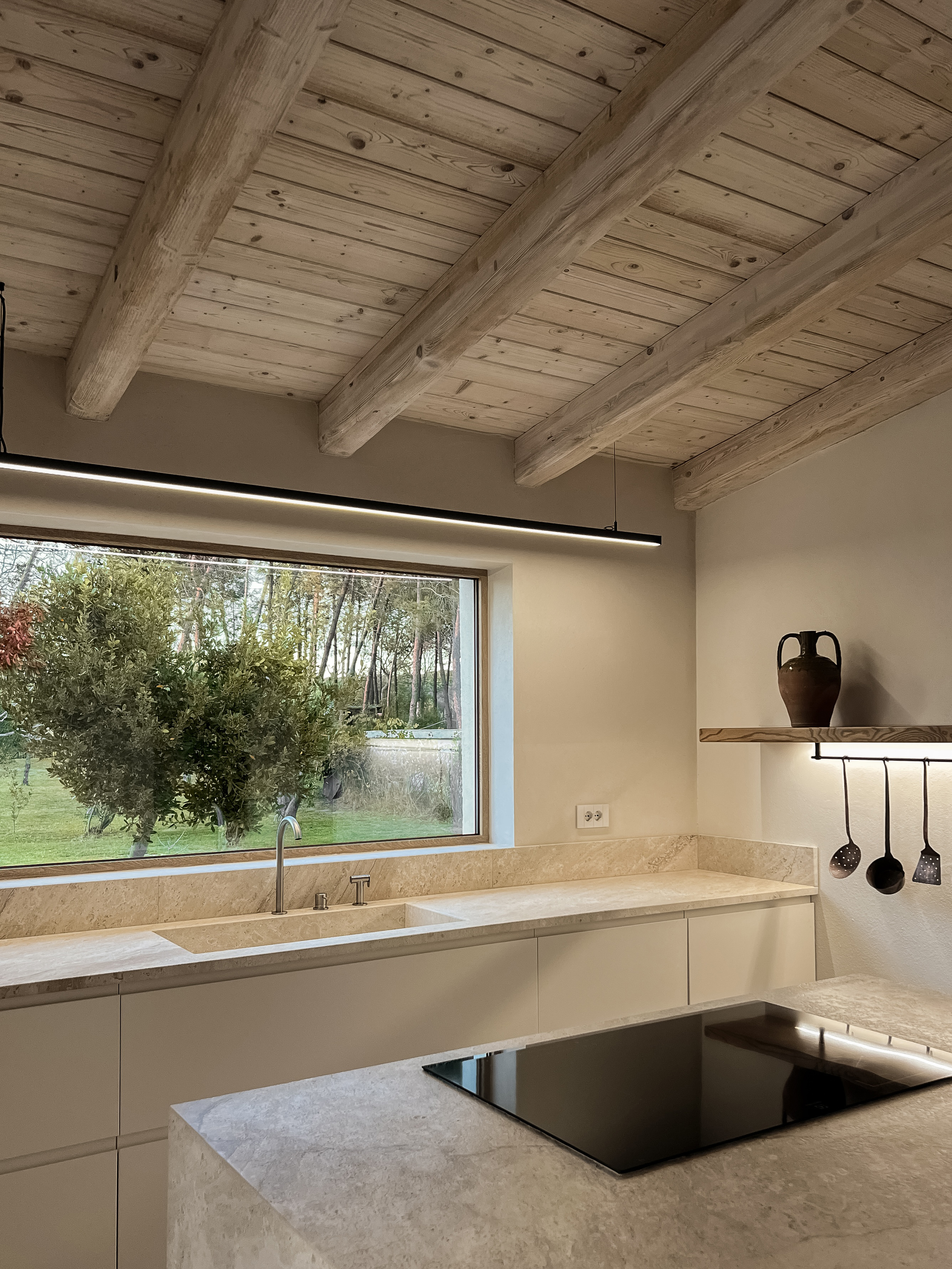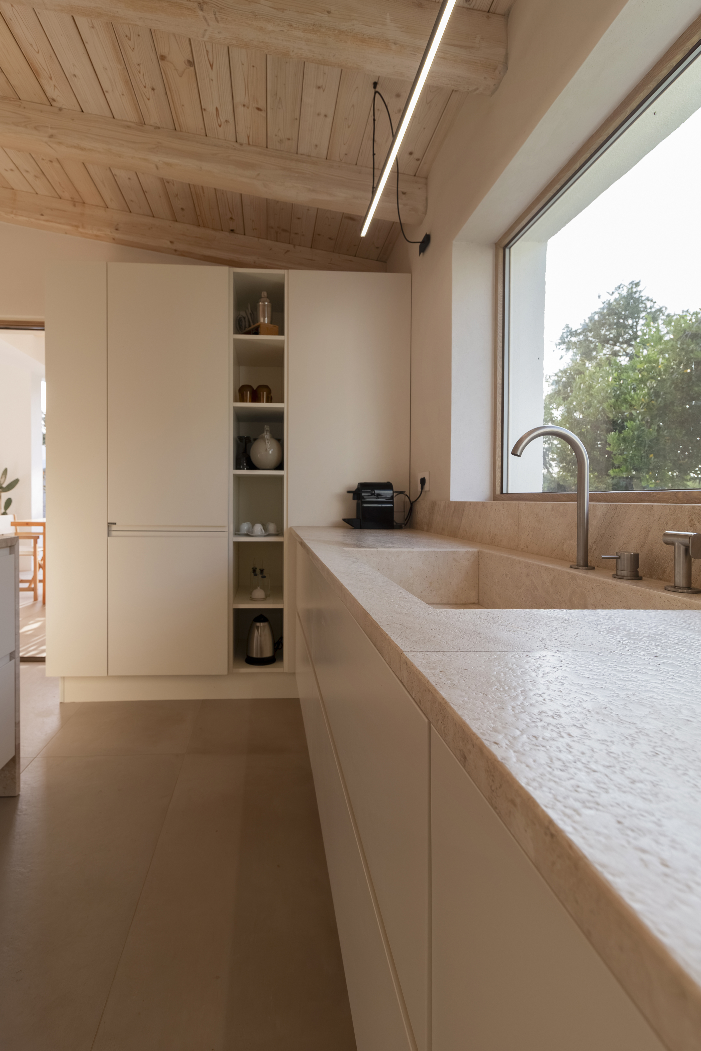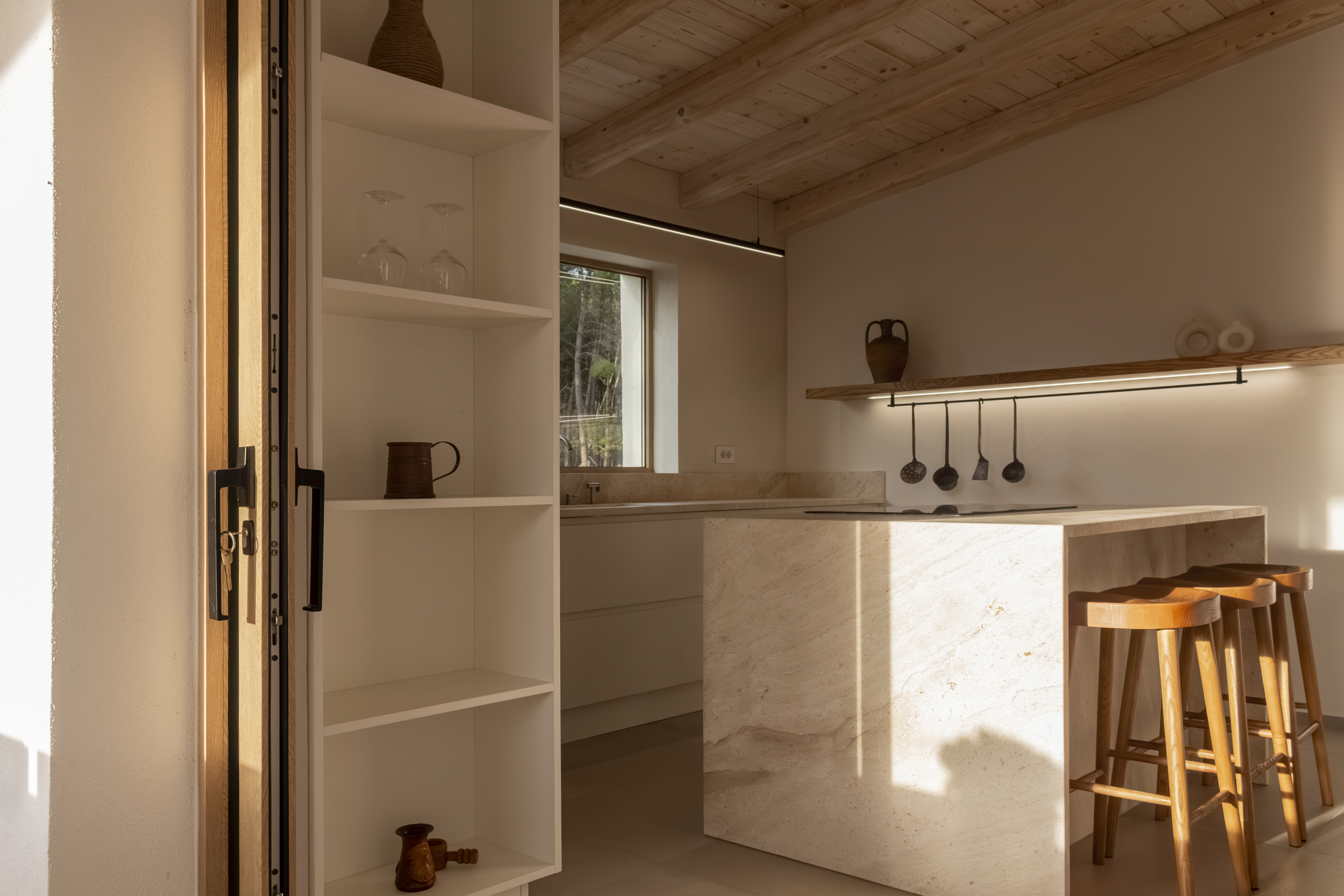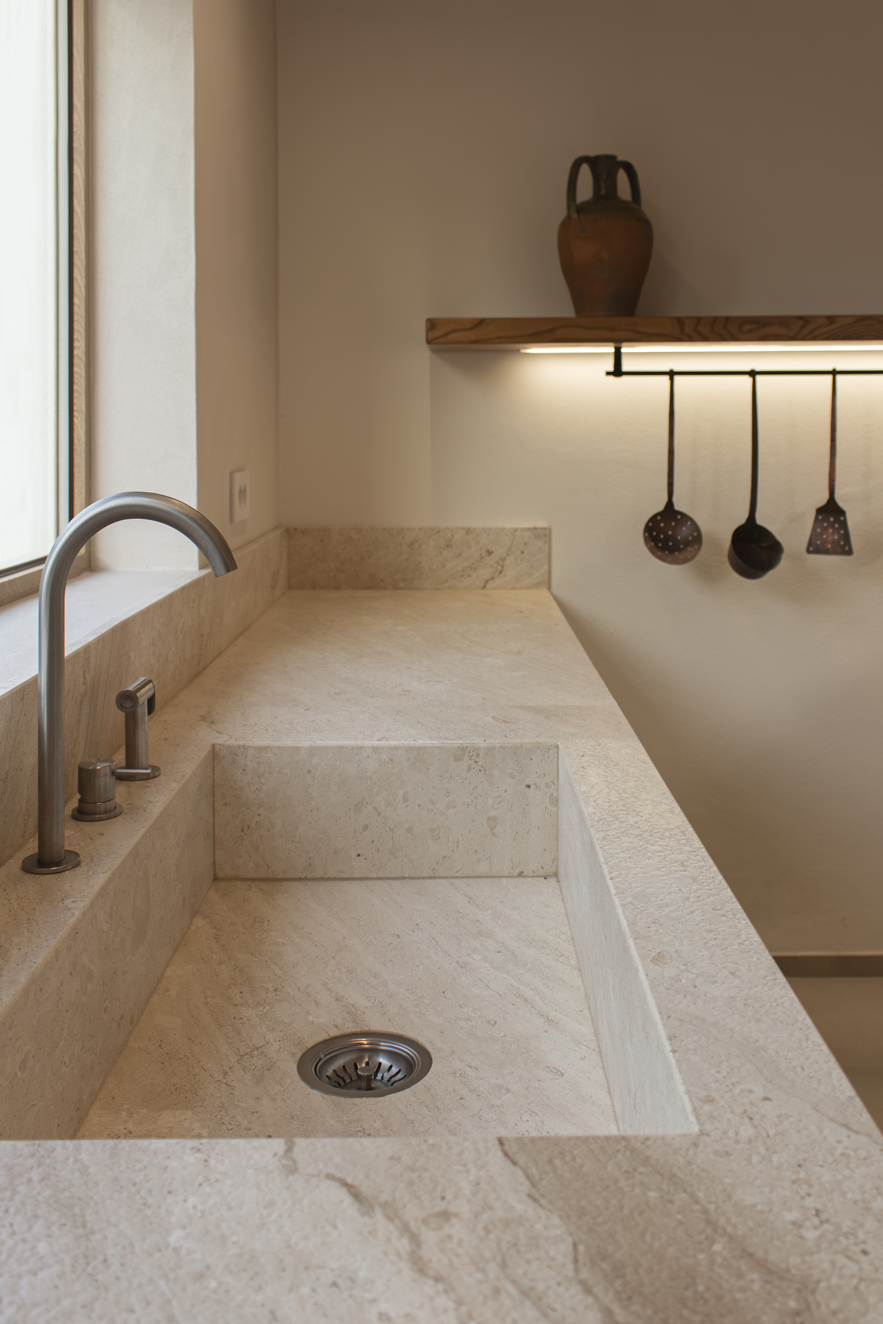 La cucina, fulcro della casa, si sviluppa attorno a un’ampia isola in marmo di Orosei, che richiama l’identità del territorio. L’equilibrio tra artigianato e design è mantenuto da alcuni elementi disegnati su misura, tra cui una mensola in legno massello, che funge da supporto per gli utensili da cucina della tradizione.
