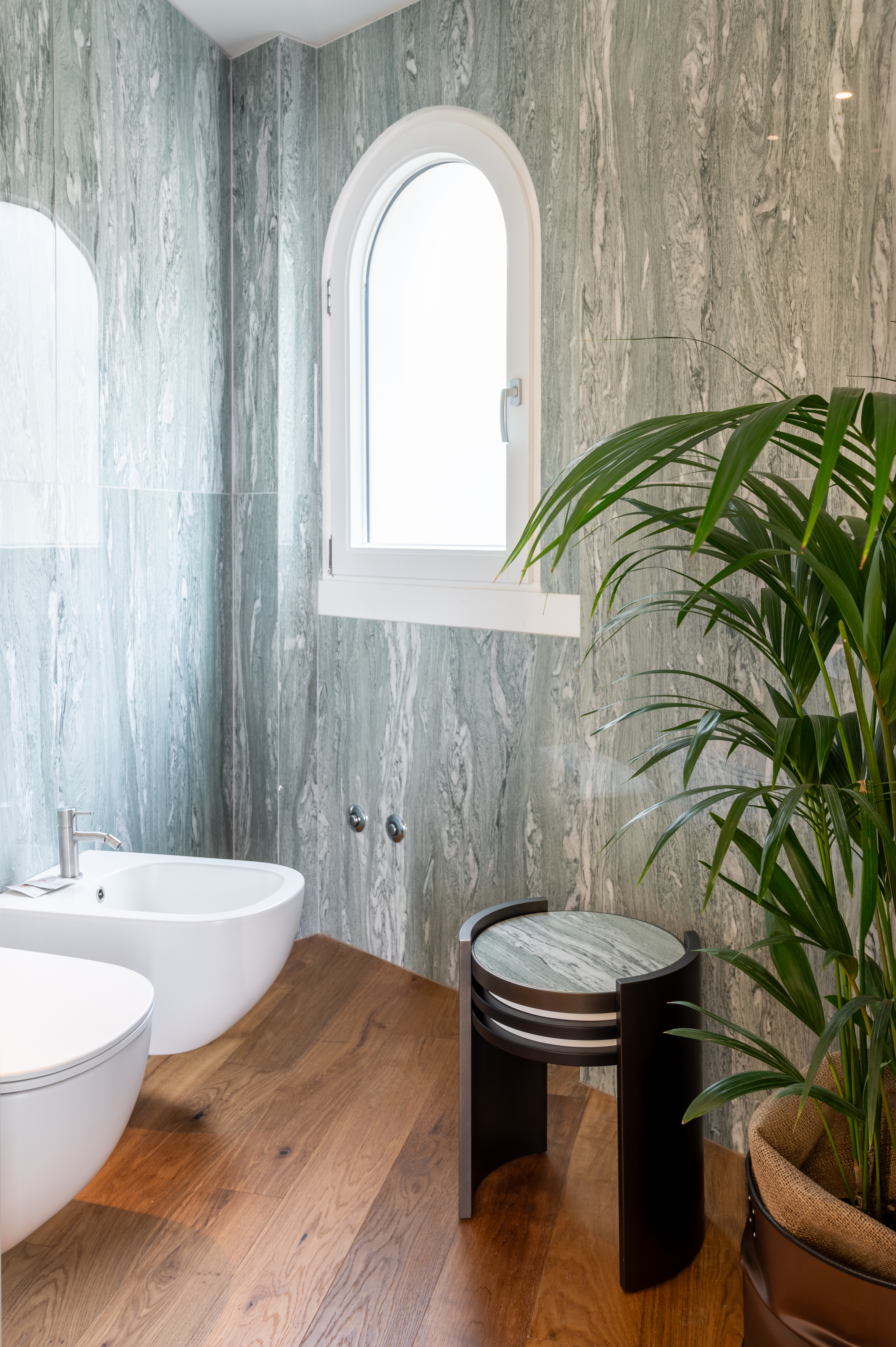 Al piano nobile, adiacente al salone principale, si cela un vero gioiello: il bagno degli ospiti. Un’oasi di raffinatezza caratterizzata da un lavabo freestanding e, come rubinetteria, la collezione Z316 di Zazzeri, interamente in acciaio, che conferisce all’ambiente un’eleganza senza tempo.