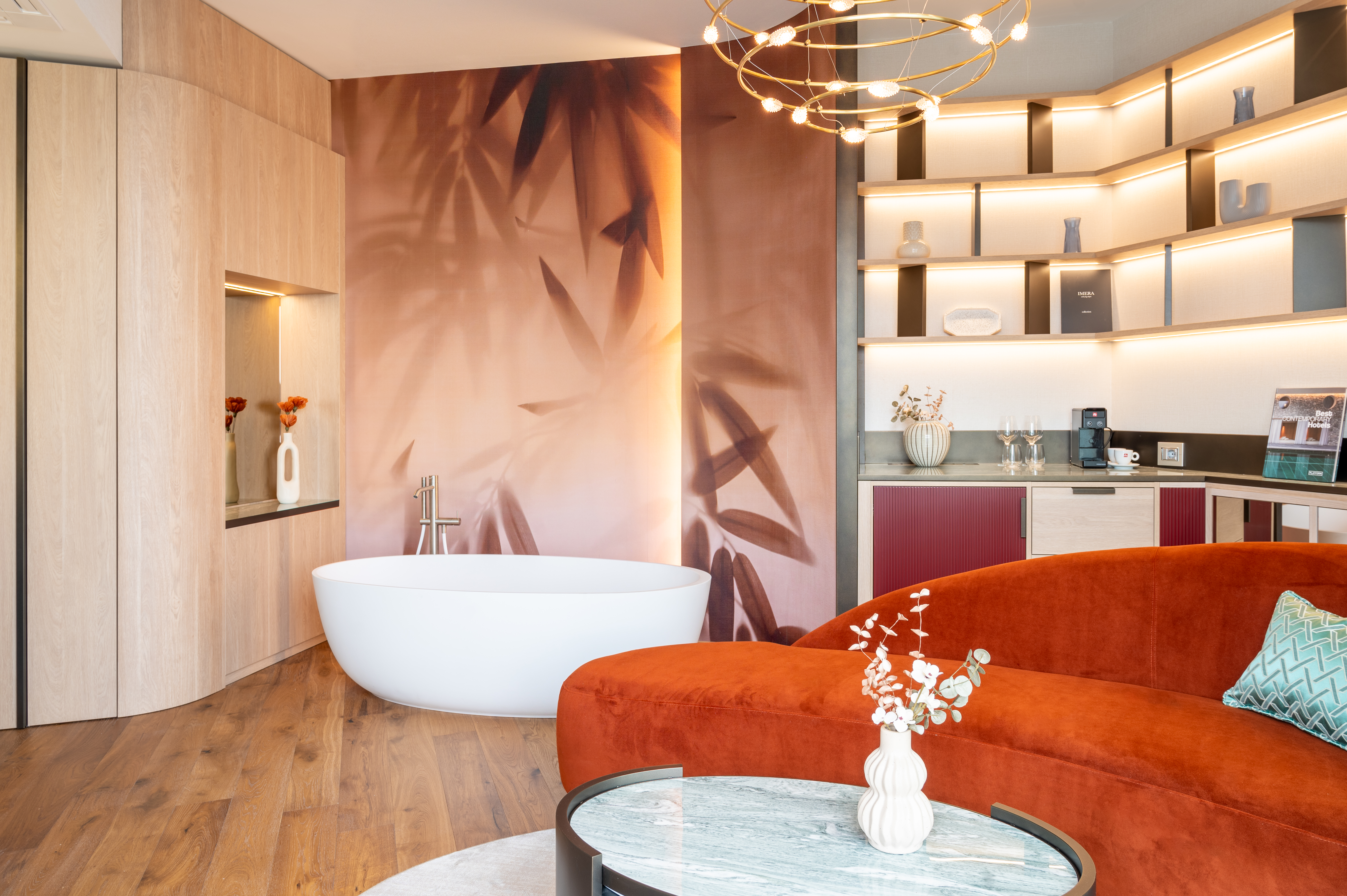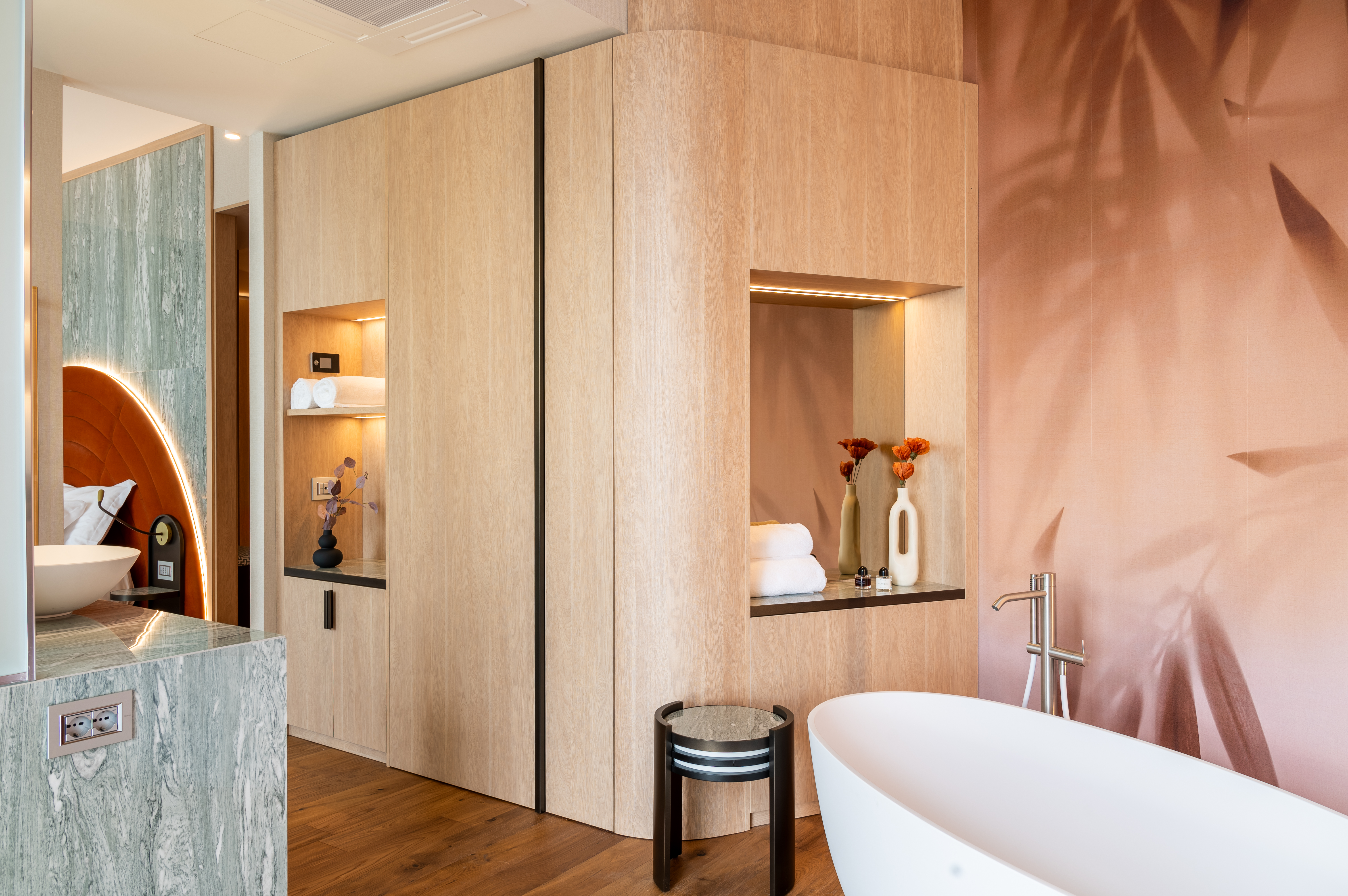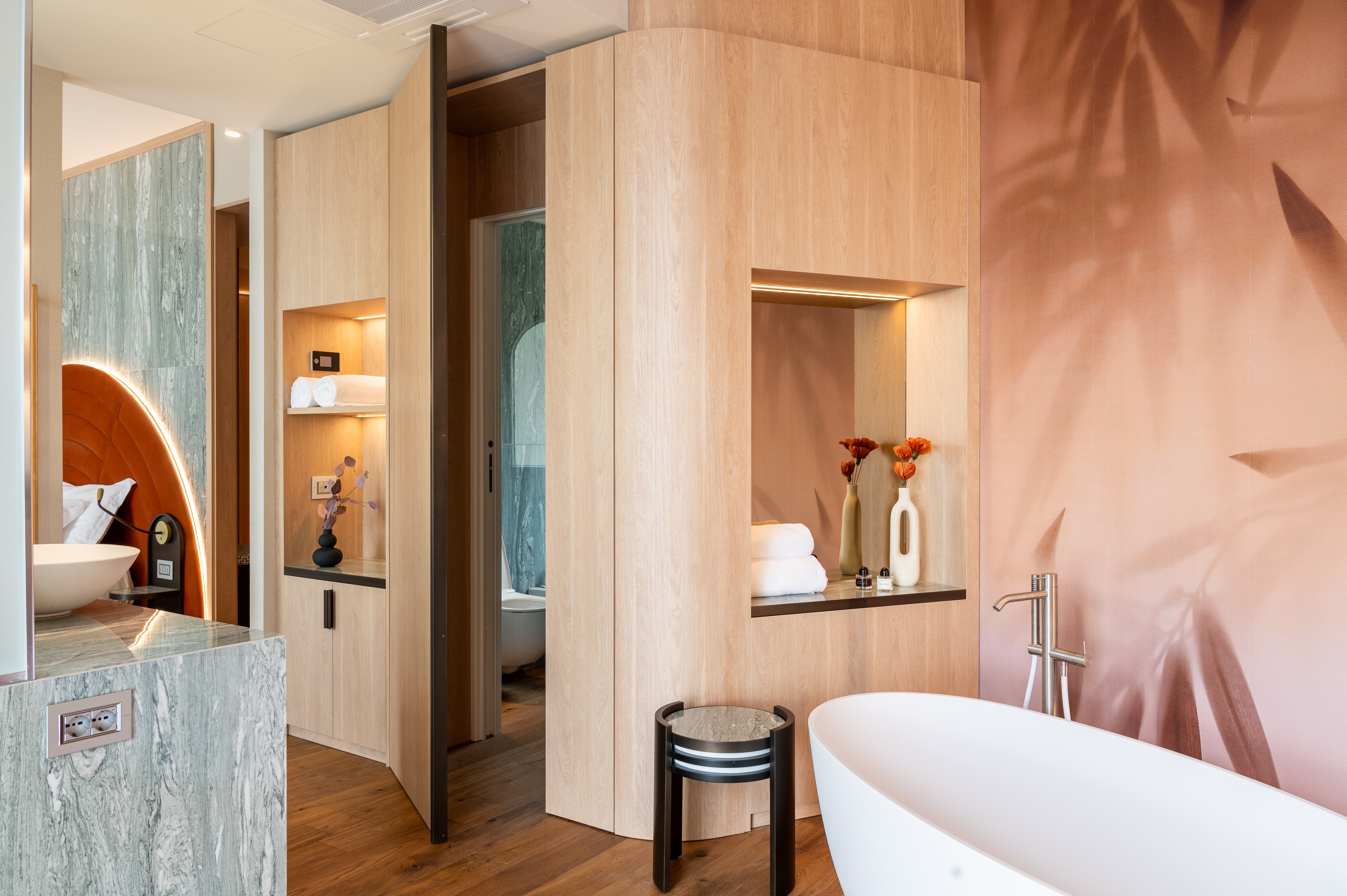 Tra i fiori all’occhiello di questa nuova suite spicca il moderno bagno openspace, adiacente all’angolo soggiorno, con vasca freestanding.