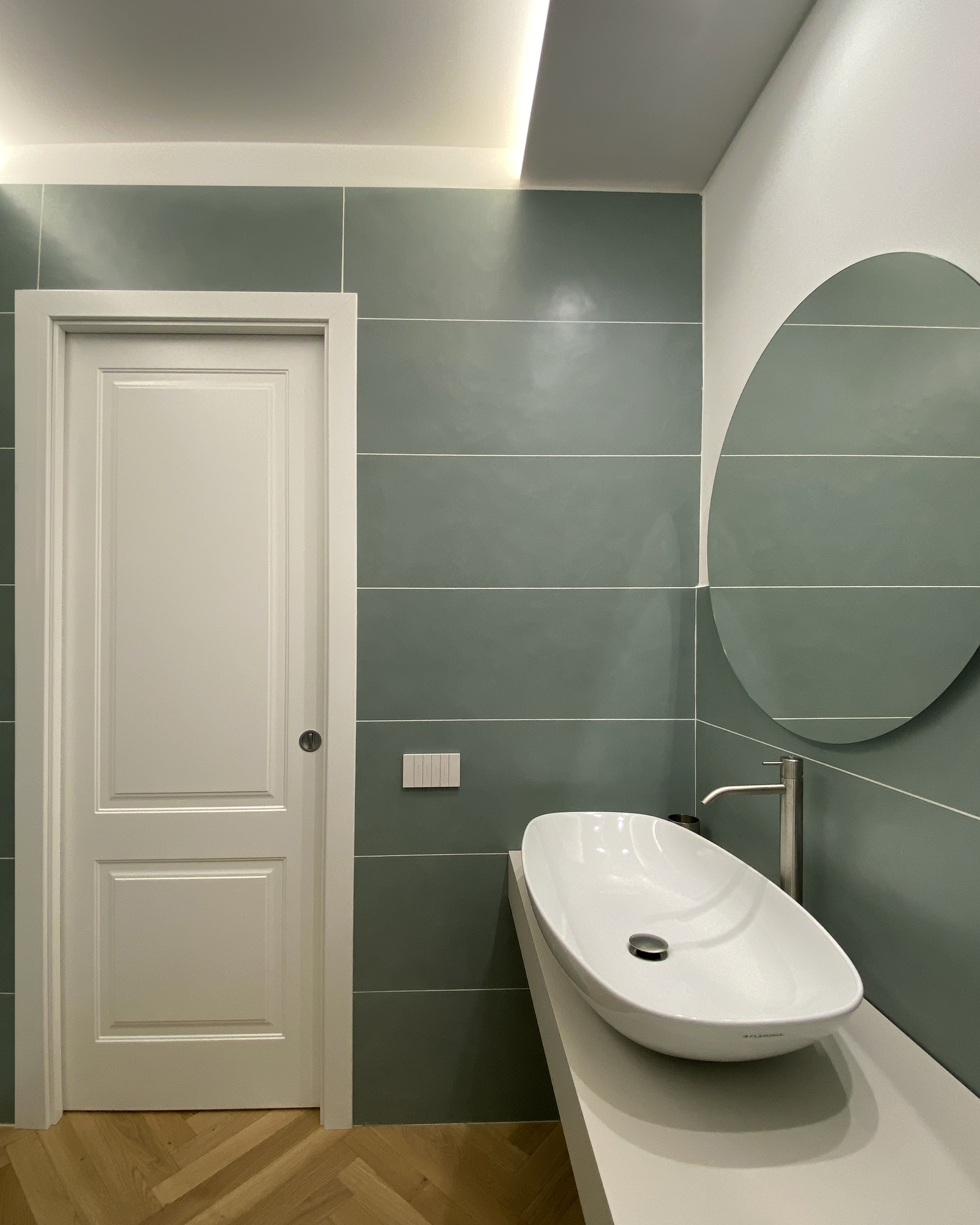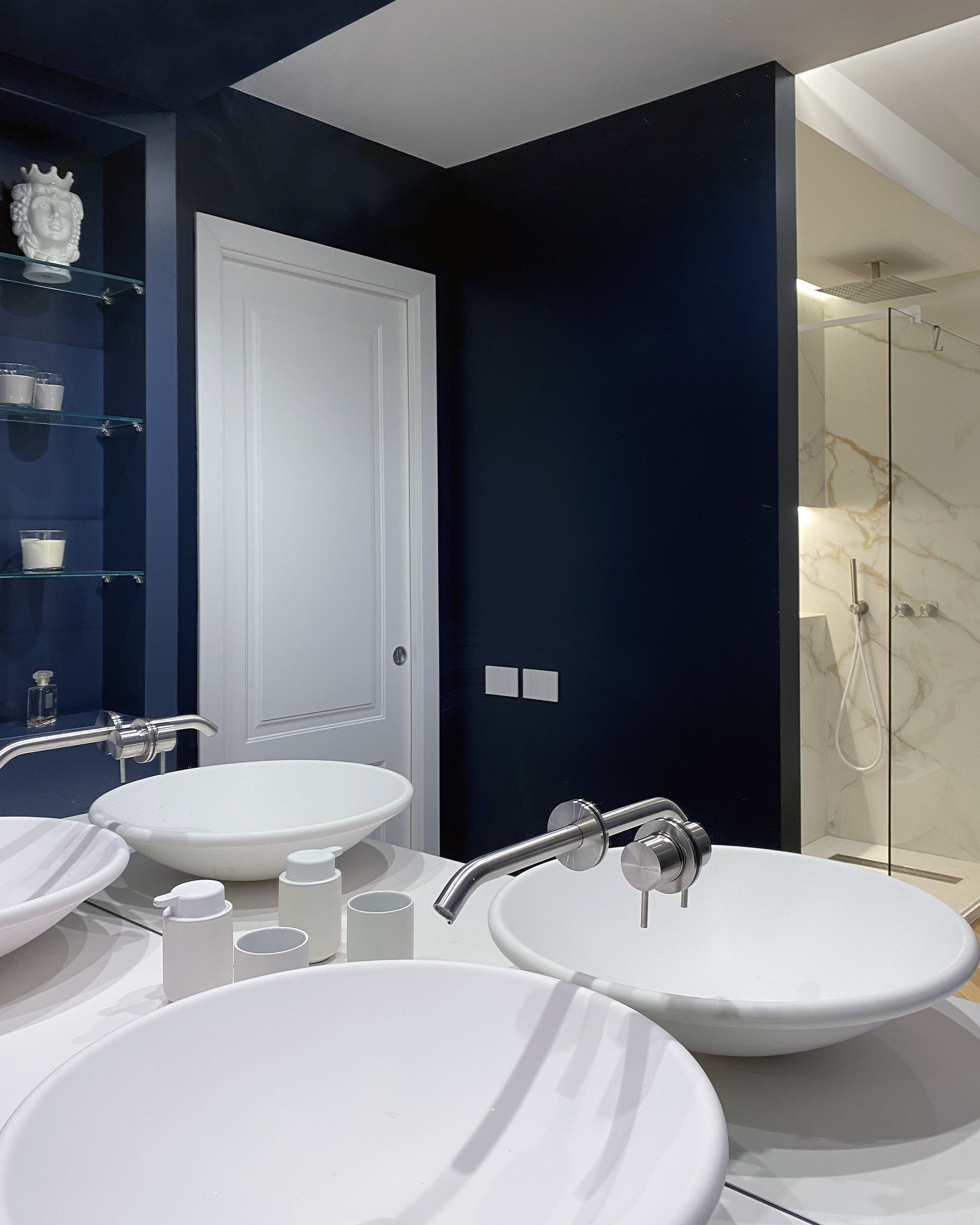 In un’abitazione privata situata in un elegante quartiere di Napoli, lo studio di architettura EF Architect/s ha progettato una sala da bagno molto sofisticata dove domina il colore blu in netto contrasto con il bianco della ceramica e il marmo di Carrara.