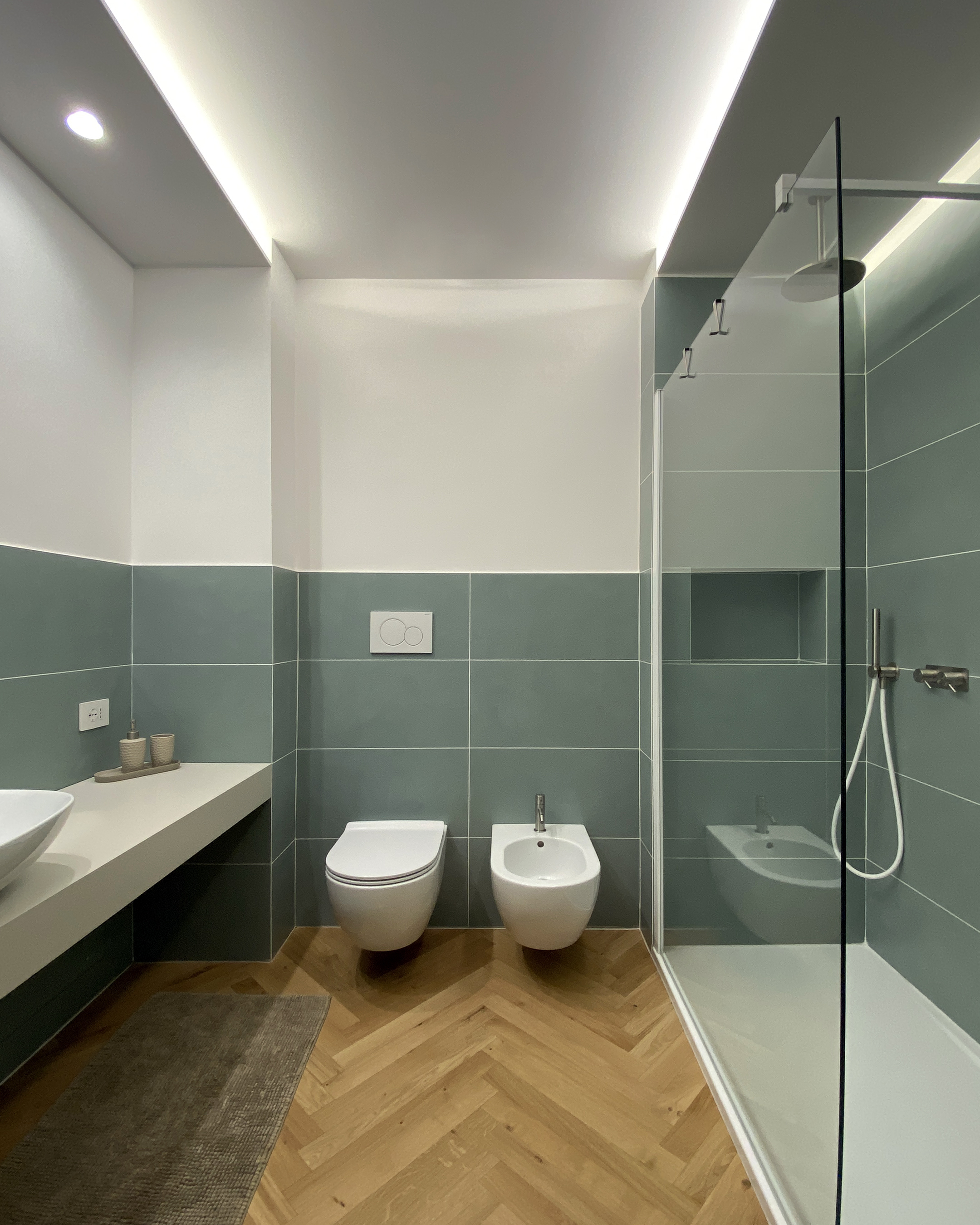 Bagno 1: Caratterizzato da rivestimenti cementizi e ferrosi, con rubinetterie in acciaio spazzolato, ed una generosa doccia in nicchia multifunzionale.