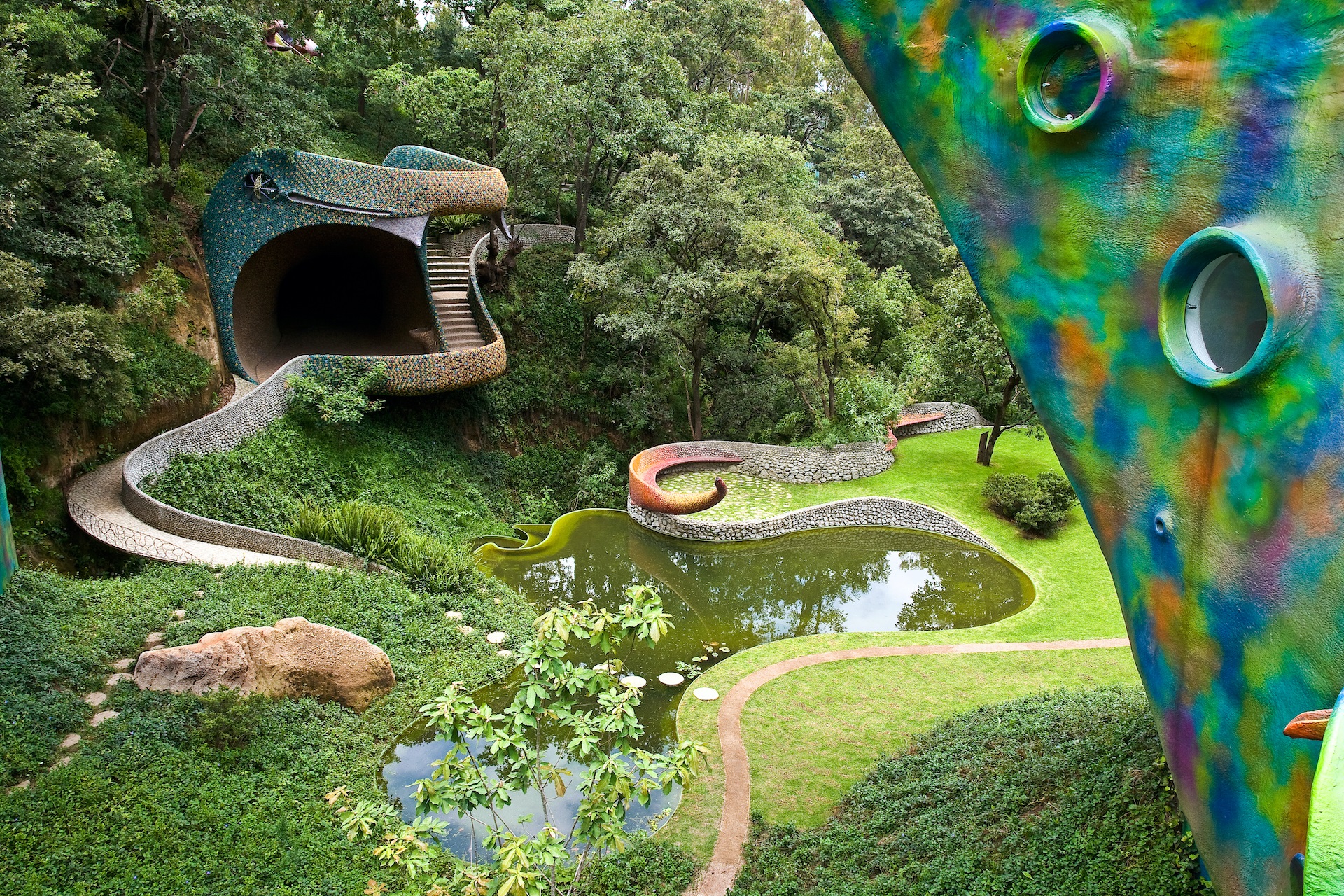 Garden-buildings consisting of sensual paths, of bright colours and the strength of natural elements. A profound and current teaching which shows that it is important to respect the organic systems and that it is necessary to work in a cautious and humble way. The Mexican master focuses his attention on the organic balances, on the morphology and the resistance of the topographical forms, just like Gaudì did: the extraordinary intelligence of the architecture of nature. Source: domusweb.it