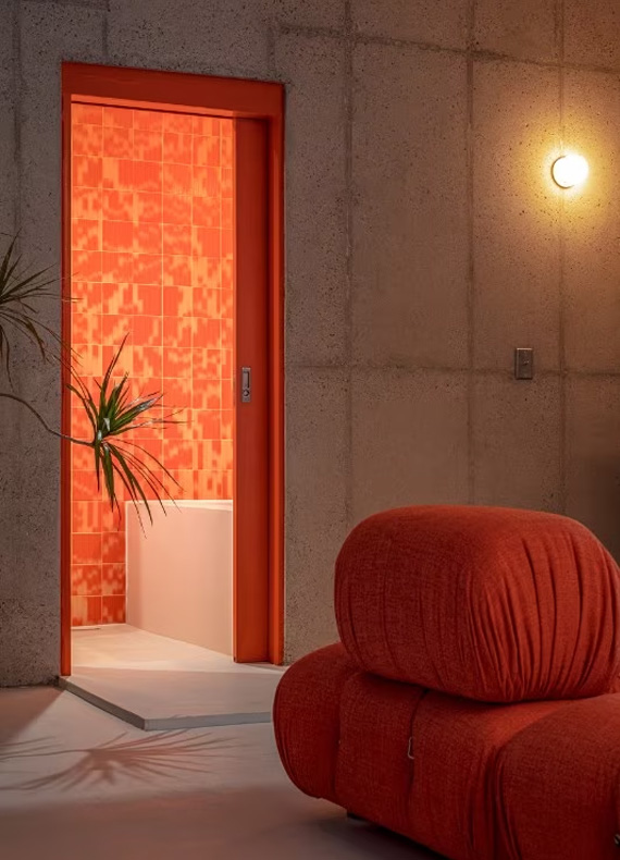 Through the floor plan, the design reveals its essentiality in the interior arrangement, where a series of contractions and expansions of space define the rooms of the house. The raw concrete finishes are also matched in the home’s interior with a few orange furnishing elements that are placed in the various rooms. The large living room in the centre of the volume connects all the spaces seamlessly and faces the outside of the house. This transition, between inside and outside, is facilitated in two ways. One way is through the thick walls that convey a feeling of protection and emphasise the body of the building. The other way is through a hole in the prism, which has allowed the creation of a protected courtyard, a natural space within the built volume of the house.