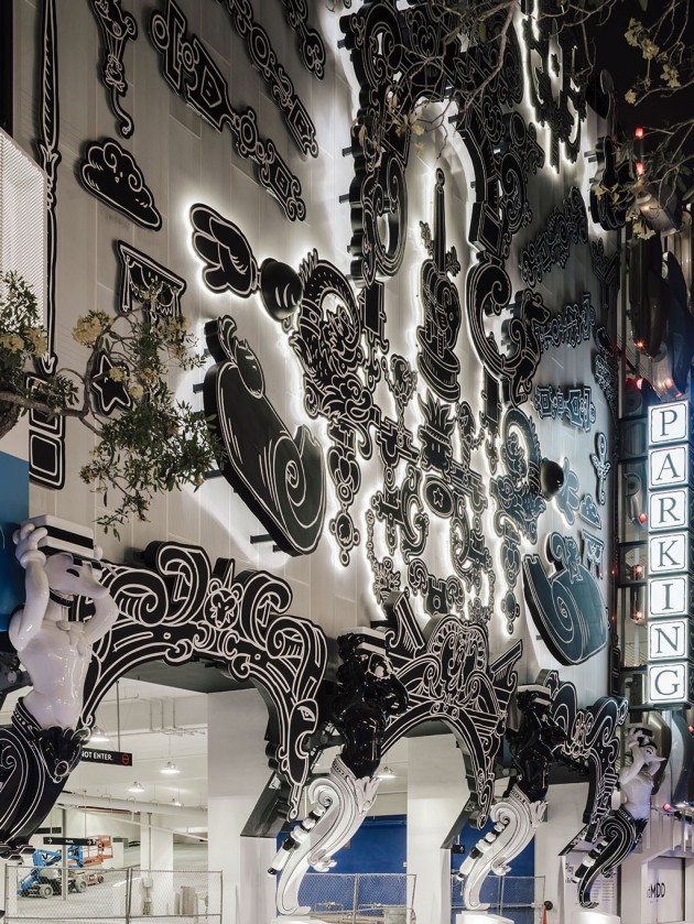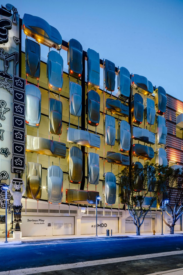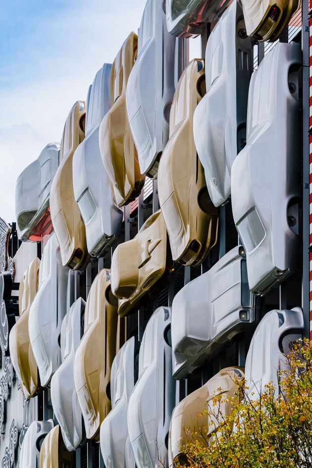 The short upper part of the building was entrusted to the New York studio Work AC, which thickened the façade in order to add a range of small public spaces which climb up to the roofing where an outdoor auditorium is located. Just around the corner, the big globular forms drawn by J. MAYER H. und Partner appear, made of metal mesh and with bright colours. The part in the middle, you go to the car park from, is entrusted to the French artist Nicolas Buffe and it is a stack of 3D printed figures which mix Manga ethics and a tribute to Baroque and to Rococo. The Spanish studio Clavel Arquitectos hangs 45 bodies of vaguely vintage vehicles painted in gold and silver suggesting a vertical traffic jam.