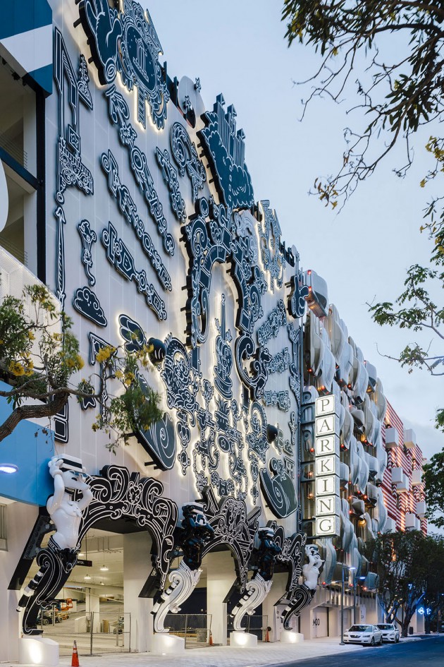 In Miami, like many other USA cities, mobility is mainly based upon cars; therefore, the success of a destination depends on the possibility to park nearby. The designer and curator Terence Riley pursued a generous as well as smart idea: he subdivided the façade into five parts, giving to as many authors (including his studio) the task to create a section of it.