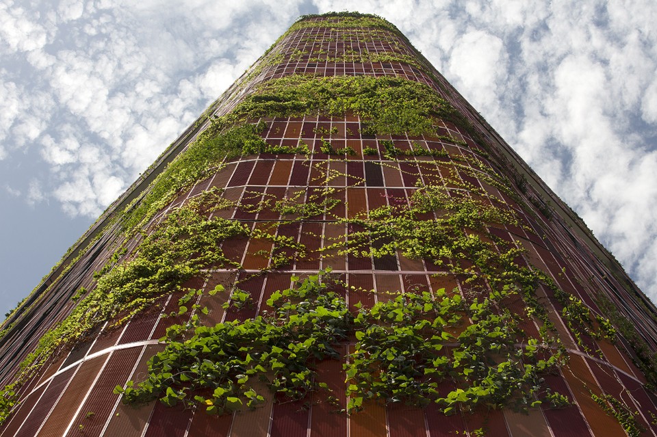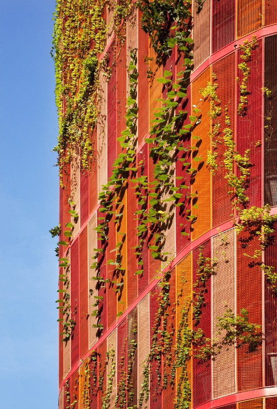 The climbers are employed as if they were a real architectonic element. The volume of the building is engraved by three wide empty spaces which work as ground floors in height and devoted to recreational activities; a fourth garden in height is located on the top of the building. These spaces efficiently improve the ventilation inside the building while the red netting combined with green represents the main device for shading