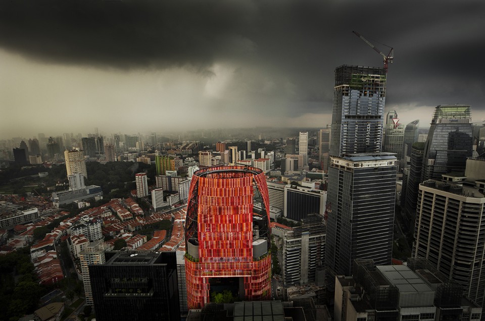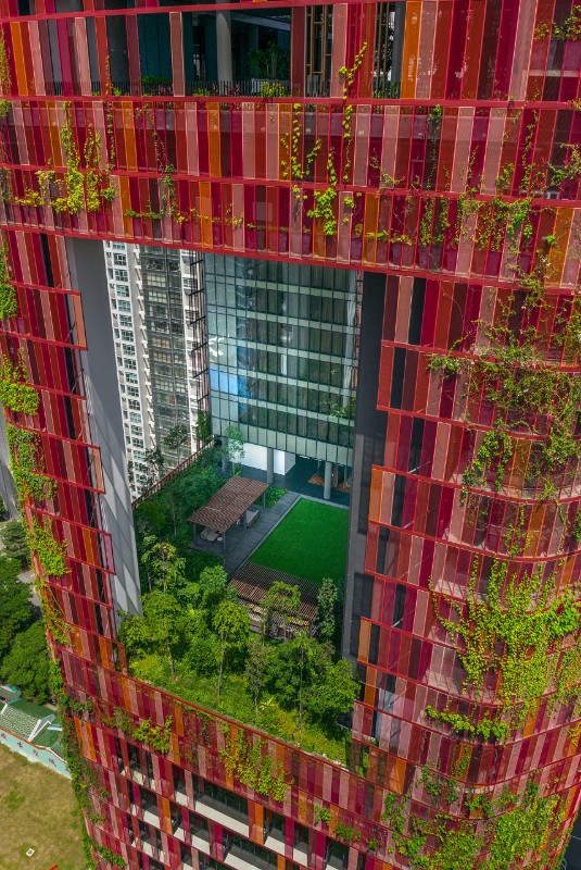 According to the design for the tower-hotel Oasia Downtown planned by WOHA in the Central Business District in Singapore, the façades were conceived as a real landscape plan. The red wire netting, enveloping the building, is the element which consents the proliferation of a luxuriant vegetation. The building won the Best Tall Building Worldwide 2018 prize during the 16th edition of the Annual Council on Tall Buildings and Urban Habitat (CTBUH).