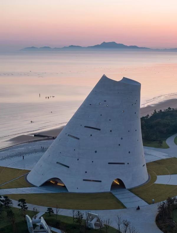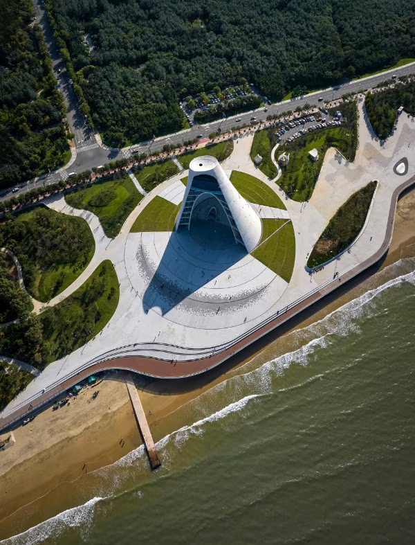 Il nuovo complesso culturale progettato da Open Architecture a Yantai, nella provincia cinese di Shandong, unisce marketing territoriale, promozione culturale e un omaggio alle tradizioni solari ancestrali. L’edificio, ispirato all’architettura visionaria di Étienne-Louis Boullée, si presenta come una grandiosa calotta parabolica tronco-conica alta 50 metri, realizzata in cemento bianco, e ospita tre principali funzioni: un teatro semi-aperto, spazi per esposizioni e una biblioteca con terrazza panoramica.