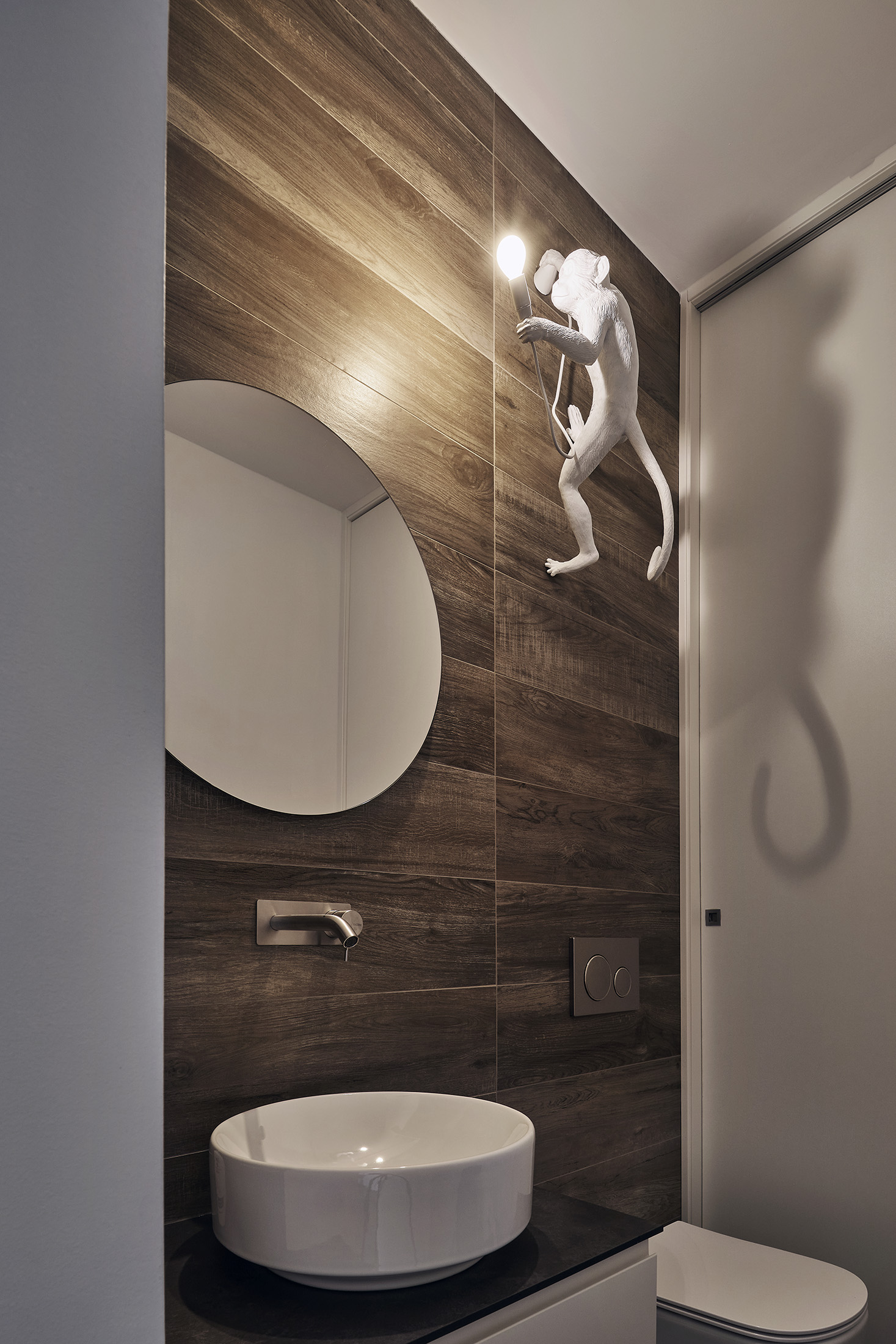 Bagno ospiti: Il più piccolo, è caratterizzato dal rivestimento effetto legno a ripresa del pavimento di casa, con rubinetterie in acciaio spazzolato e illuminazione scultorea.