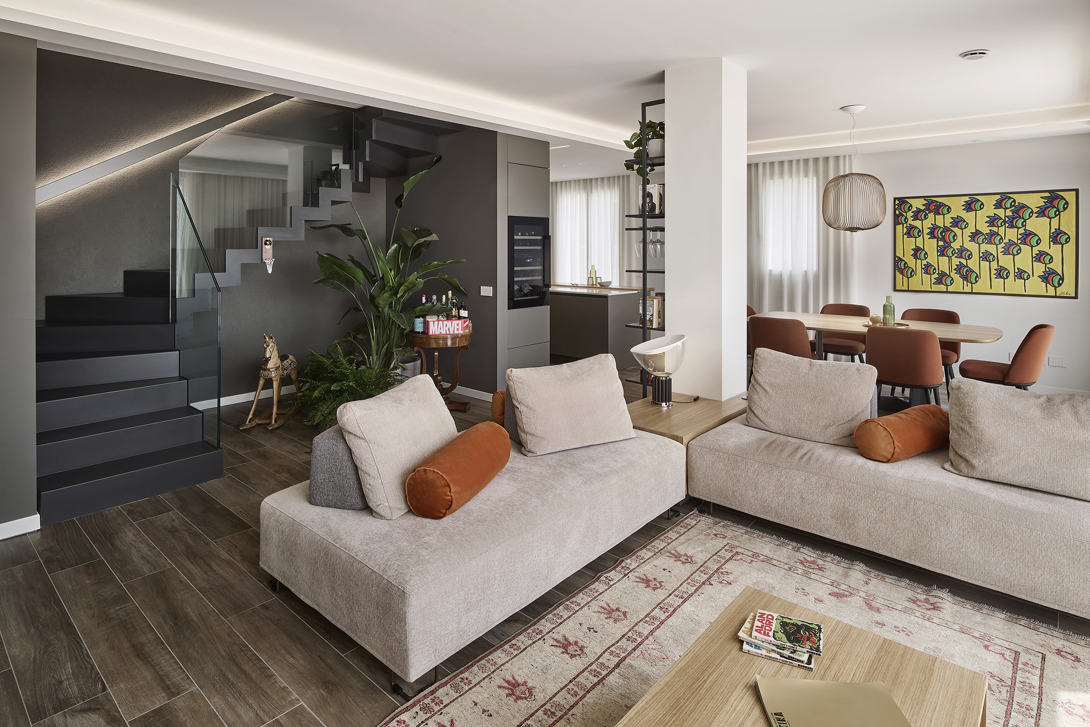 La casa combina elementi di design moderno con un’atmosfera calda ed accogliente, creando uno spazio che è allo stesso tempo funzionale ed esteticamente piacevole.